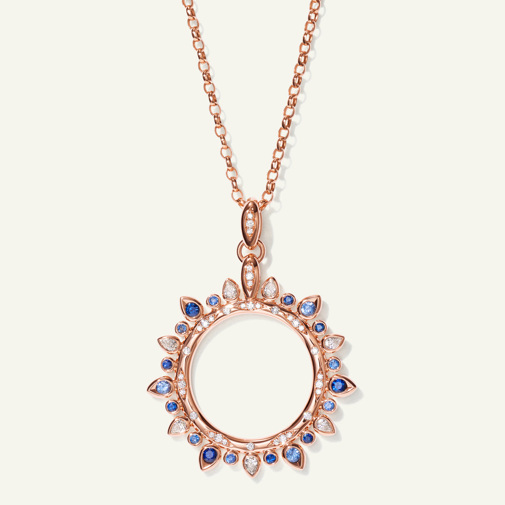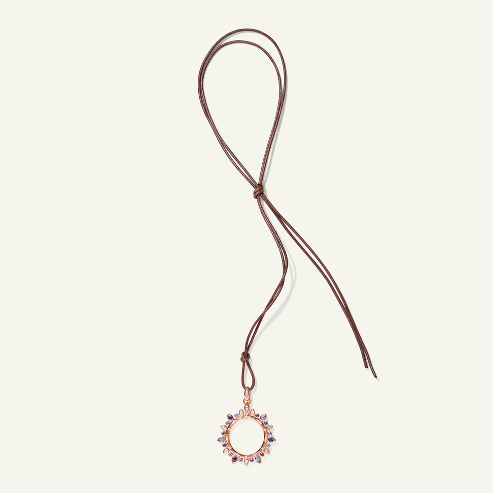 Fresh and radiant, the GYPSY Large Sun Pendant in the Color Story ‘Ocean’ captures the spirit of the sea. A vivid palette of cool blue and green gemstones accented with shimmering diamonds is artfully arranged in a radiant sun pendant in 18K gold, symbolizing serenity, vitality, and endless horizons. Lightweight and full of life, it shines effortlessly on a casual leather cord or a delicate gold chain.