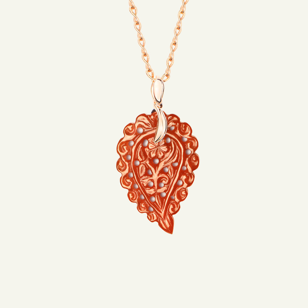 The INDIA Small Pendant in 18K gold features artfully carved Terra Onyx, showcasing warm, earthy brown tones in an elegant leaf shape. Designed to dangle delicately from a chain, it’s a beautiful everyday favorite that adds a touch of sophistication to any look. Perfect for adding dimension to a layered look.