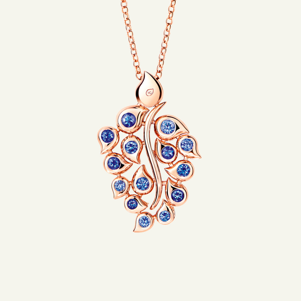 The SNOWFLAKES Leaf Pendant in ‘Sky’ shimmers with soft aquas, deep ocean blues, and light sky tones on one side and brilliant white diamonds on the other, all set in 18K gold. Worn on a long chain or a casual leather cord, this pendant is versatile - an elegant choice for everyday luxury and special occasions.