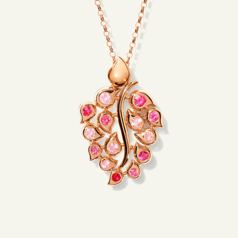 The SNOWFLAKES Leaf Pendant in ‘Blush’ sparkles with pink sapphires on one side and brilliant white diamonds on the other, all set in 18K gold. Worn on a long chain or a casual leather cord, this pendant is versatile - an elegant choice for everyday luxury and special occasions.