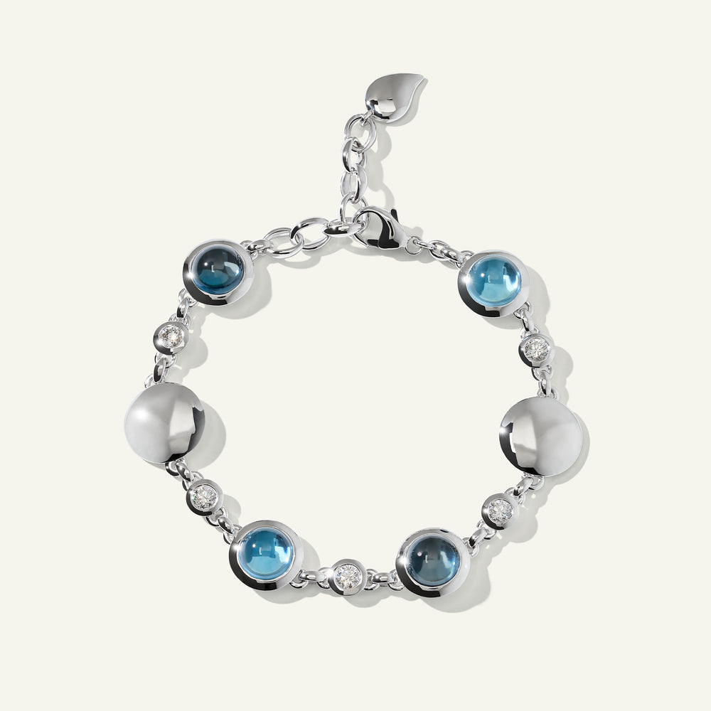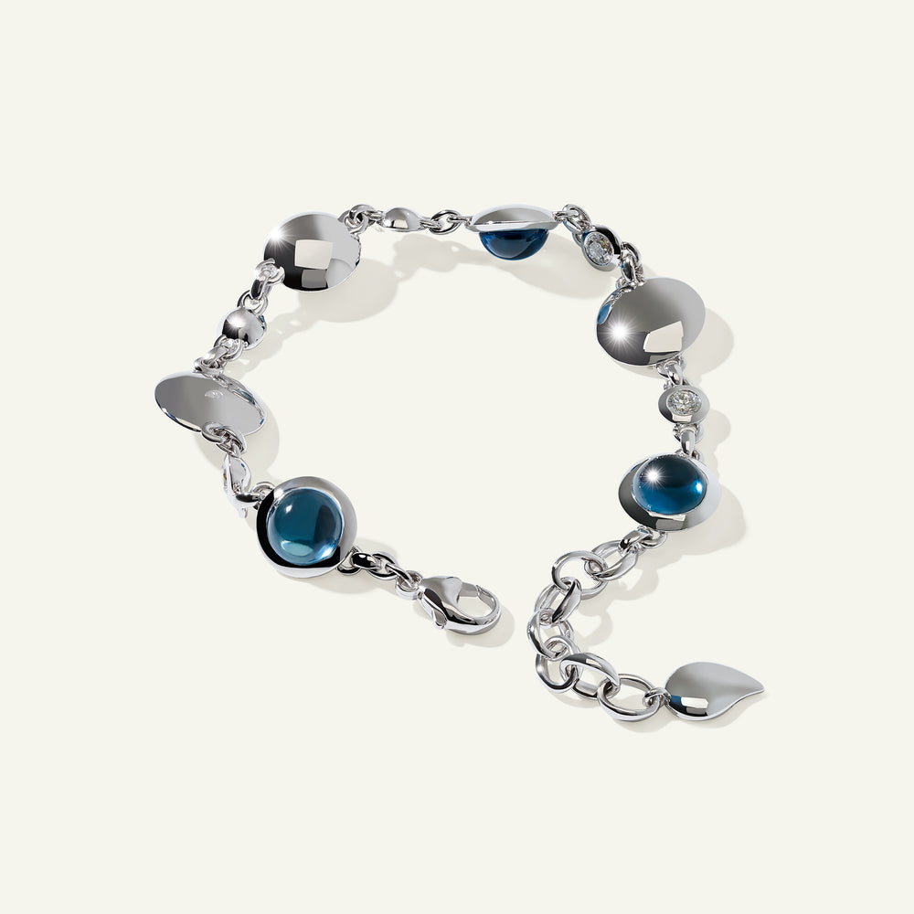 The BOUTON Bracelet in ‘Sky’ is set with luminous cabochon-cut gemstones in airy blue and soft neutral tones accented by sparkling white Diamonds. Created with a flexible design, it offers a perfect fit and versatile style for every wrist. A timeless piece you'll cherish for years to come.