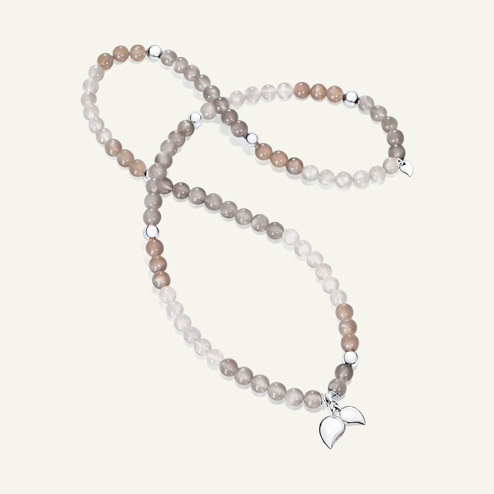 The INDIA Medium Bracelet in the ‘Cashmere’ Color Story features Moonstone gemstones in soft, natural cool tones of brown, grey, and white, accented with 18K gold elements and two dangling drop charms. Strung on elastic for a comfortable fit, this triple-wrap design can also be worn as a necklace, offering versatile style and understated elegance.