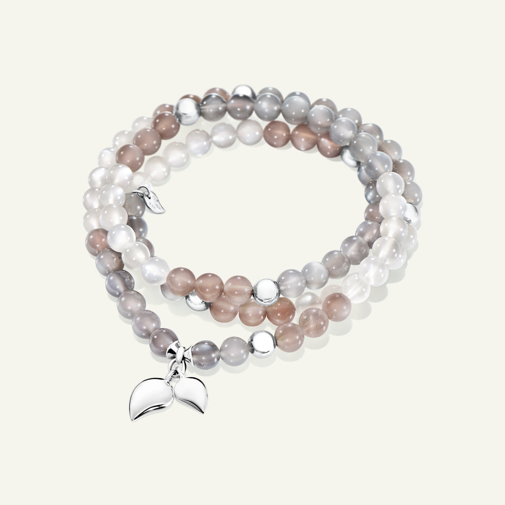 The INDIA Small Bracelet in the ‘Cashmere’ Color Story features Moonstone gemstones in soft, natural cool tones of brown, grey, and white, accented with 18K gold elements and two dangling drop charms. Strung on elastic for a comfortable fit, this triple-wrap design can also be worn as a necklace, offering versatile style and understated elegance.