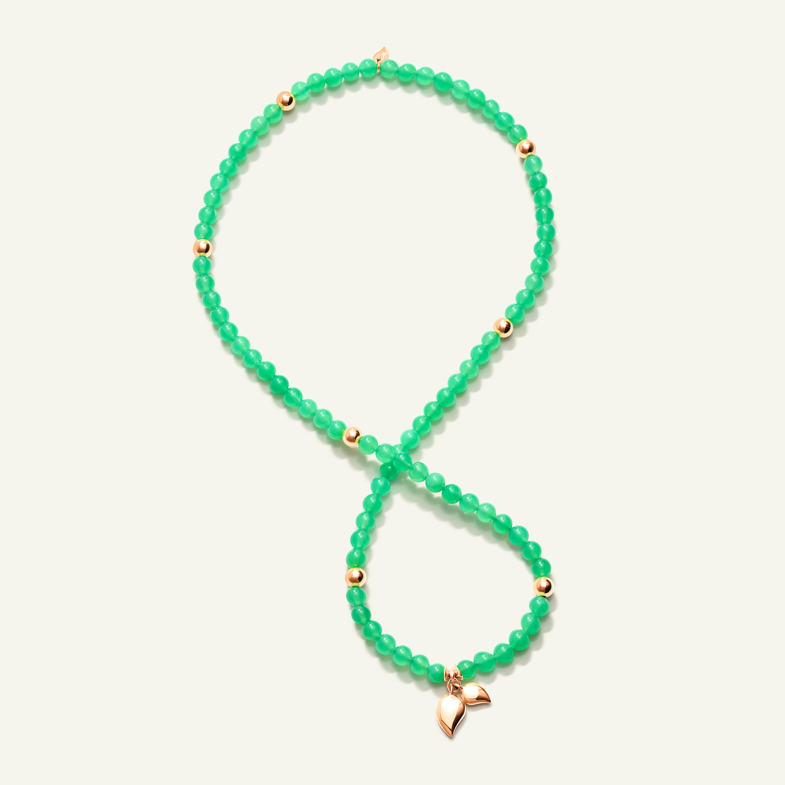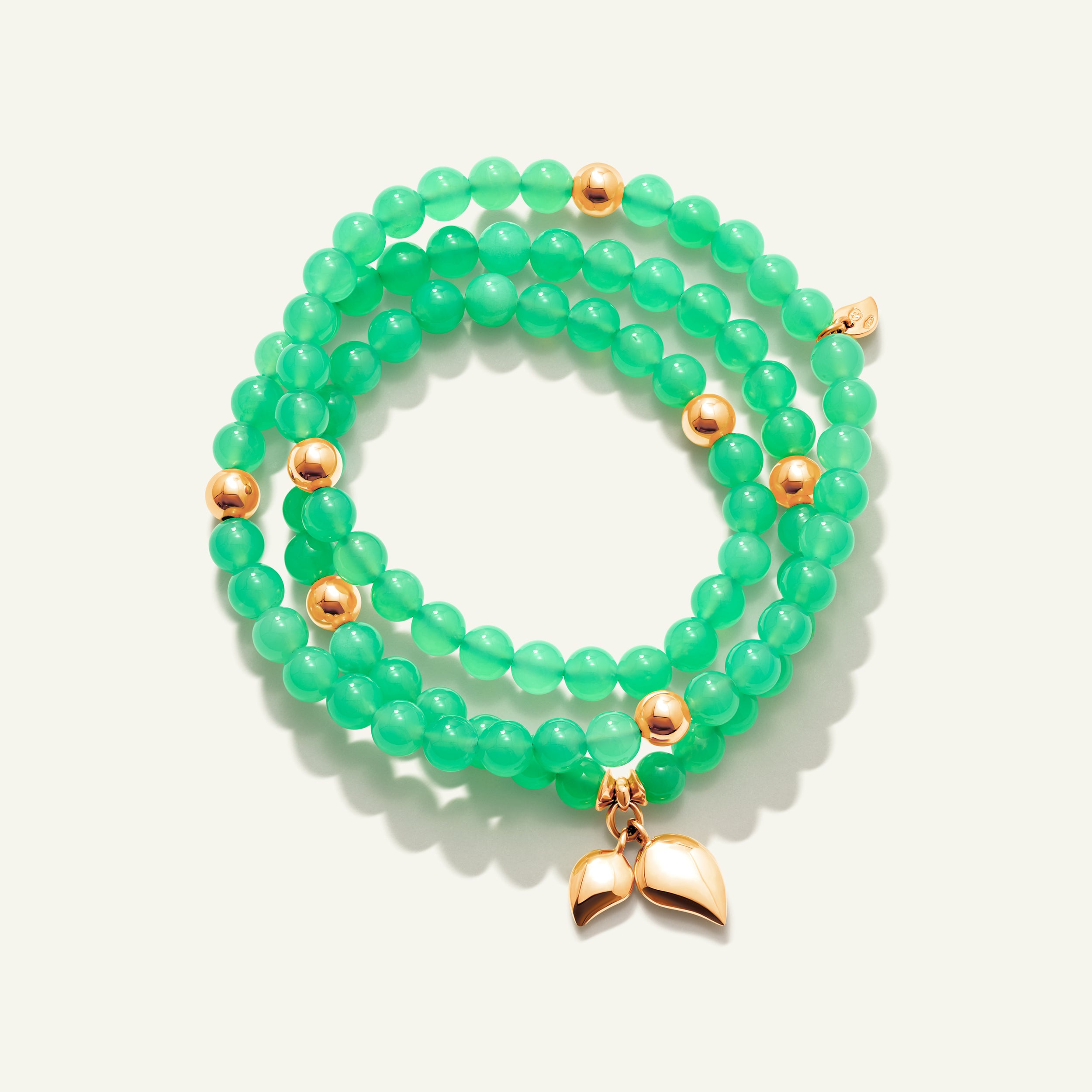 The INDIA Medium Bracelet features polished African Chrysoprase, a rare gemstone prized for its vibrant green color, accented with 18K gold beads and the iconic water drop charms. Strung on elastic for a comfortable fit, this triple-wrap design can also be worn as a necklace, offering versatile style and a striking statement.