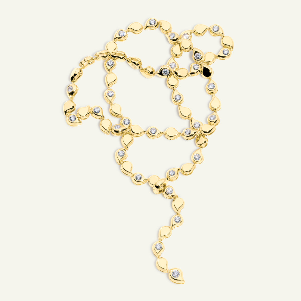 The SNOWFLAKES Alternating Rivière Collier Necklace in ‘Classic’ showcases the iconic water drop motif in a striking sequence of polished 18K gold and brilliant white diamonds. Gentle movement between each setting evokes the sensation of flowing water along the neckline. The length is adjustable, with a clasp that can be fastened between any of the drops for a perfect fit. A timeless statement, this necklace embodies casual luxury.