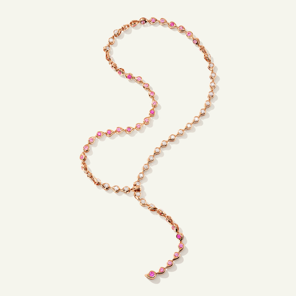 The SNOWFLAKES Rivière Collier Necklace in ‘Blush’ showcases the iconic water drop motif in a radiant sequence of pink sapphires and brilliant white diamonds, set in 18K gold. Gentle movement between each setting evokes the sensation of flowing water along the neckline. The length is adjustable, with a clasp that can be fastened between any of the drops for a perfect fit. A timeless statement, this necklace embodies casual luxury.