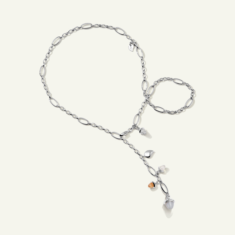 The MIKADO Delicate Necklace in ‘Cashmere’ features acorn-shaped pendants in soft, neutral moonstone tones. Delicate water drop elements and a sparkling Diamond Pavé pendant dance along the handcrafted 18K gold chain. The adjustable length makes it a versatile piece for any occasion.
