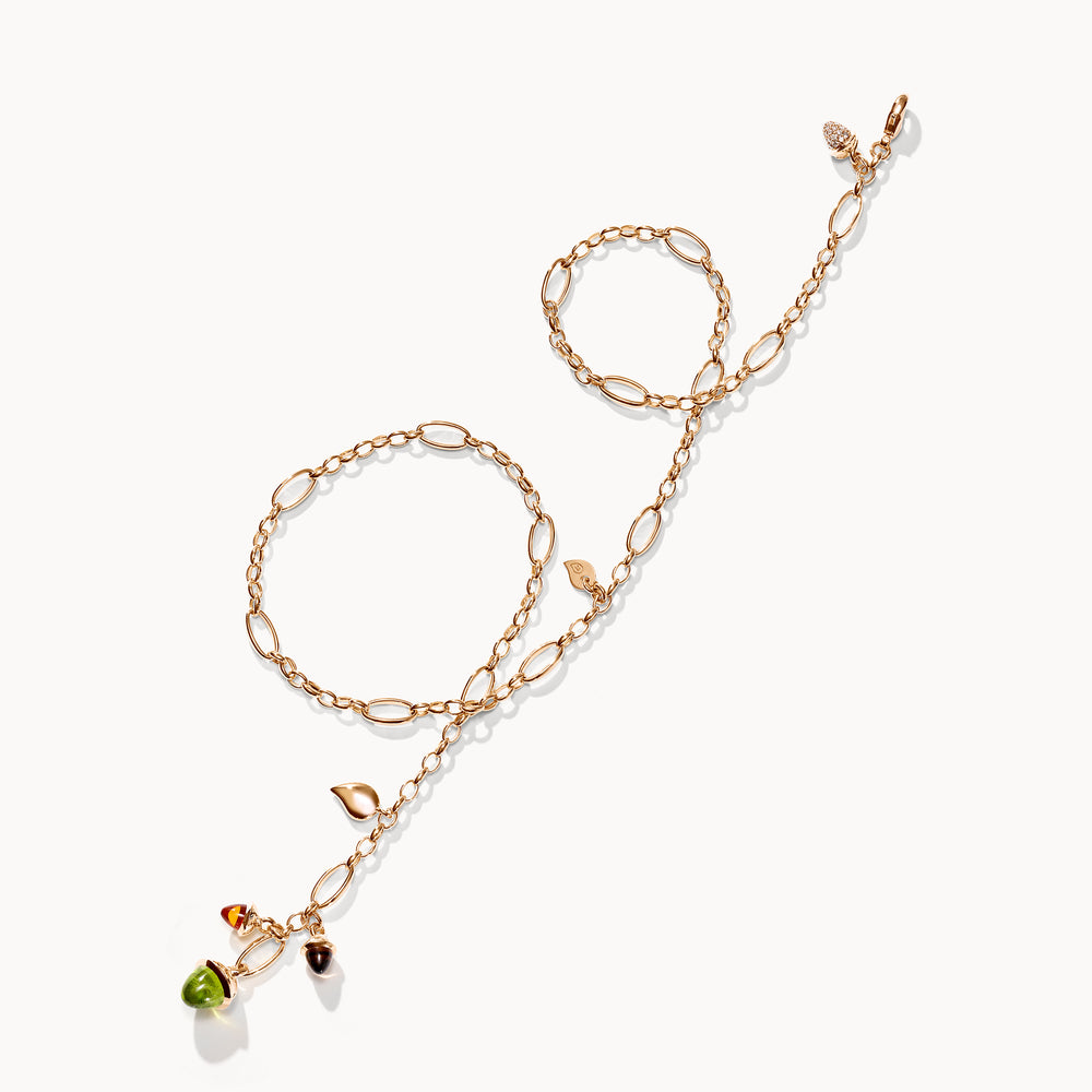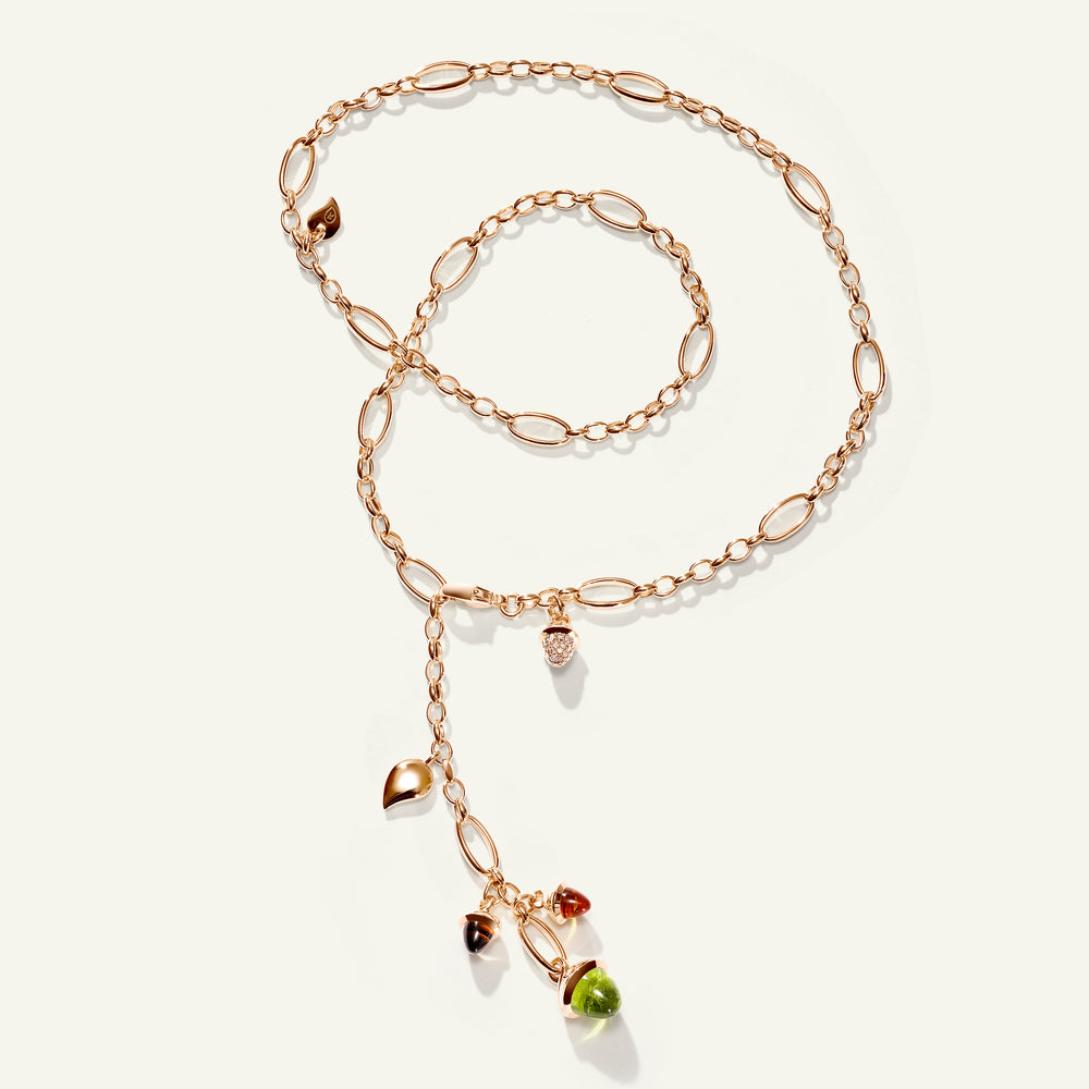 The MIKADO Delicate Necklace in ‘Indian Summer’ features acorn-shaped pendants in warm shades of green, red, and orange. Delicate water drop elements and a sparkling Champagne Diamond Pavé pendant dance along the handcrafted 18K gold chain. The adjustable length makes it a versatile piece for any occasion.