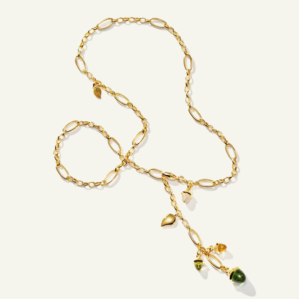 The MIKADO Delicate Necklace in ‘Rainforest’ features acorn-shaped pendants in lush green tones. Delicate water drop elements and a sparkling Diamond Pavé pendant dance along the handcrafted 18K gold chain. The adjustable length makes it a versatile piece for any occasion.