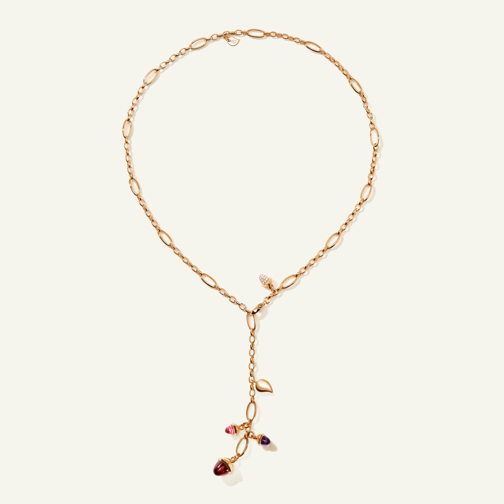 The MIKADO Delicate Necklace in ‘Wildberry’ features acorn-shaped pendants in luscious shades of blackberry, raspberry, and blueberry. Delicate water drop elements and a sparkling Diamond Pavé pendant dance along the handcrafted 18K gold chain. The adjustable length makes it a versatile piece for any occasion.