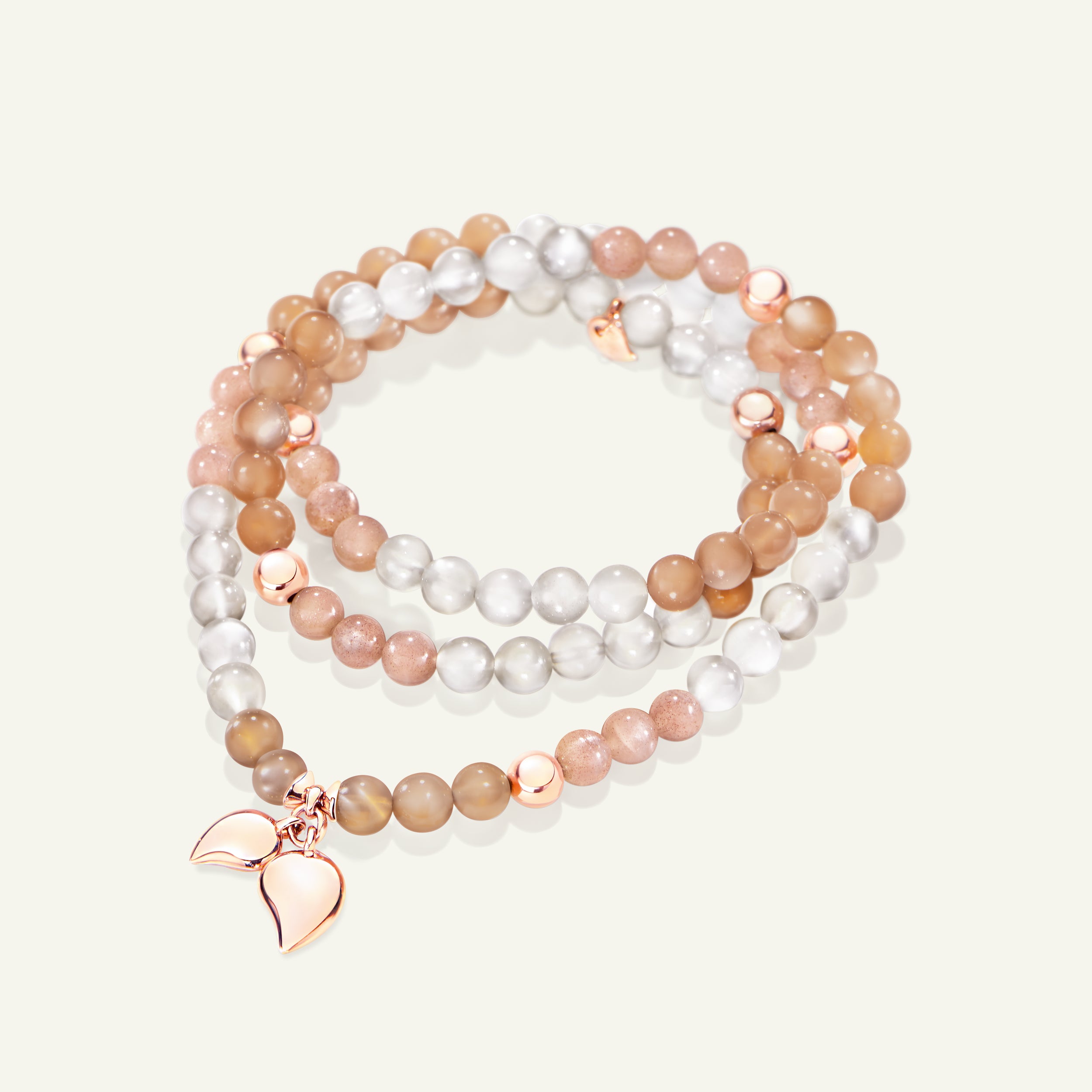 The INDIA Medium Bracelet in the ‘Camel’ Color Story features Moonstone gemstones in warm, earthy shades, accented with 18K gold elements and two dangling drop charms. Strung on elastic for a comfortable fit, this triple-wrap design can also be worn as a necklace, offering versatile style and natural elegance.