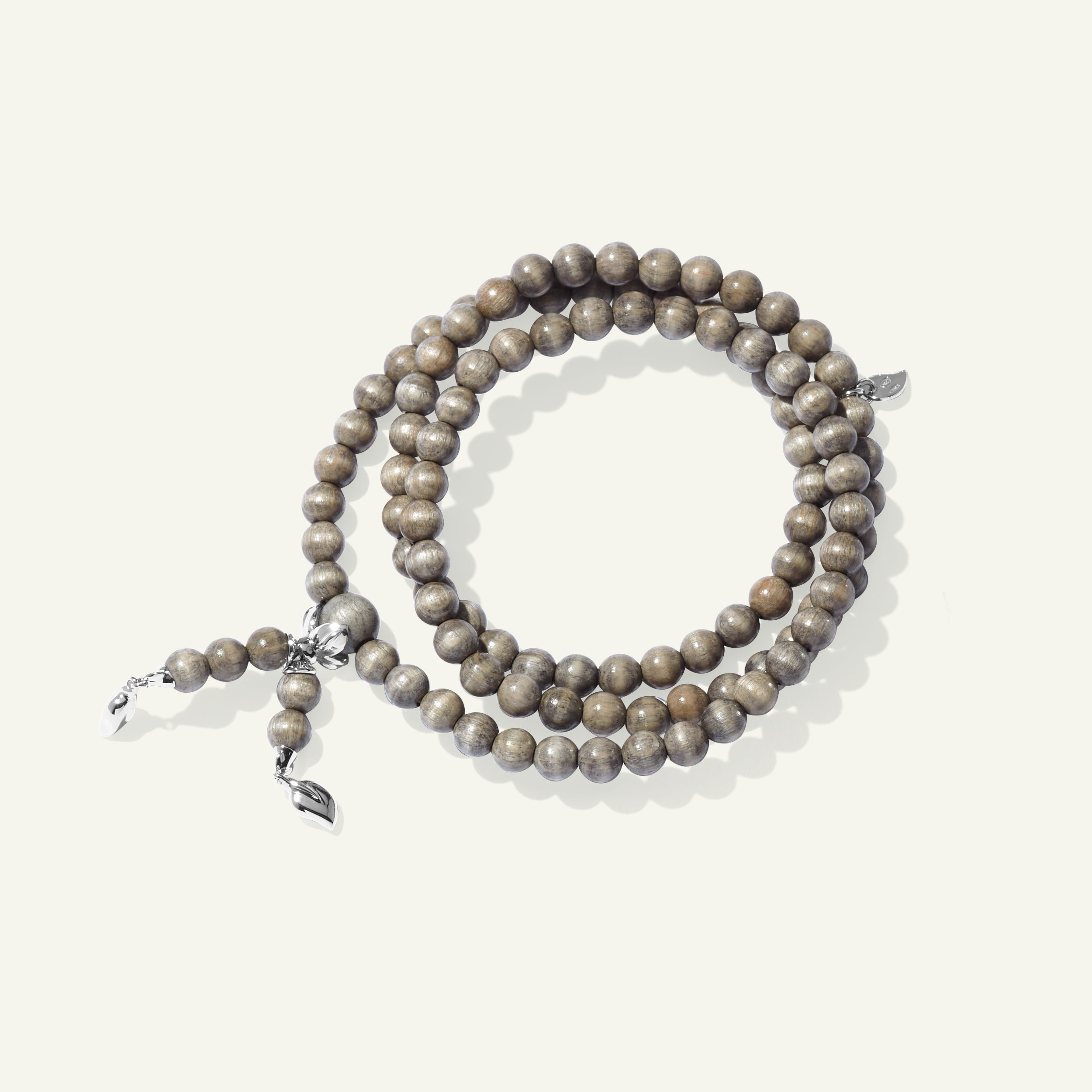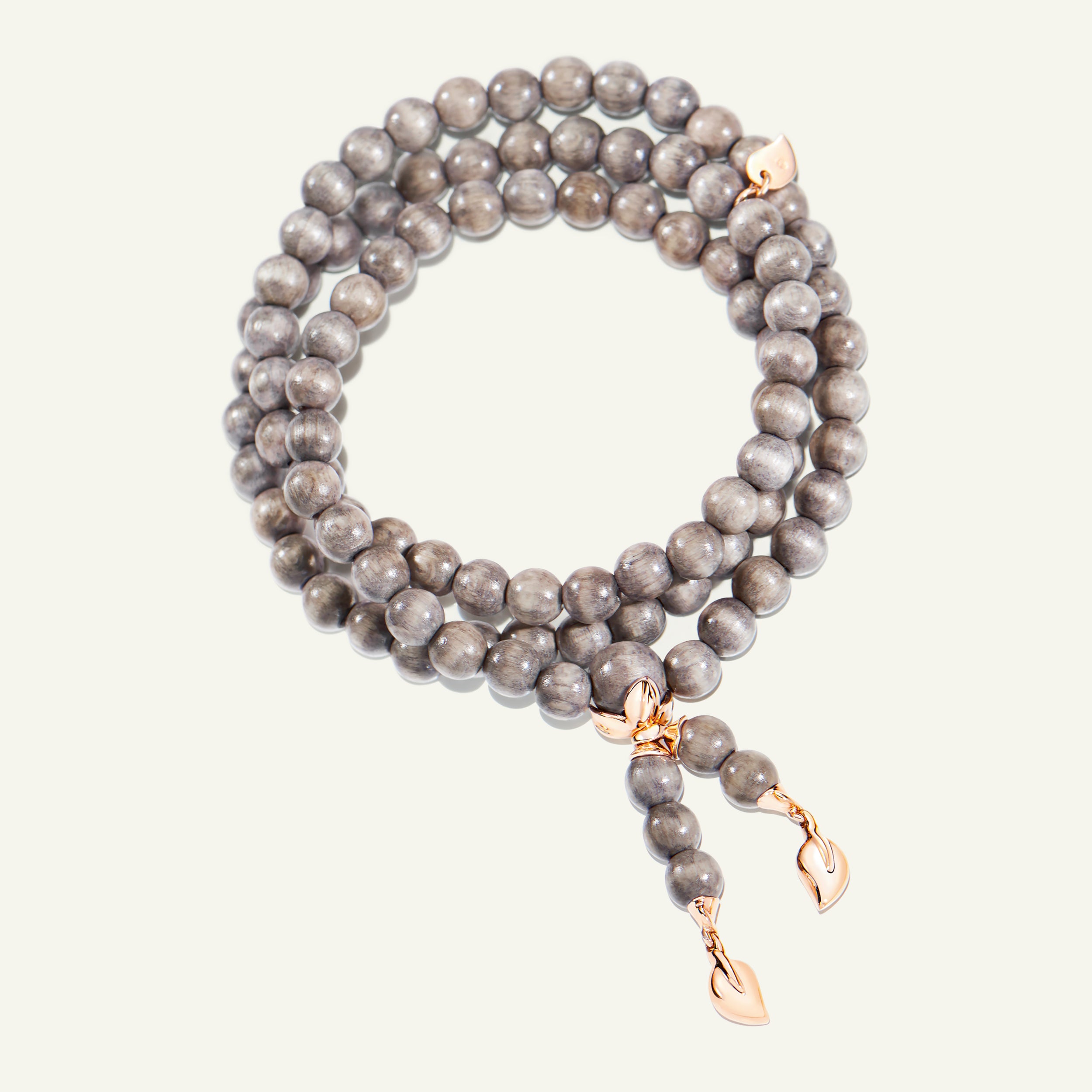 The INDIA Large Bracelet features smooth Greywood beads accented with 18K gold beads and the iconic water drop charms. Strung on elastic for a comfortable fit, this triple-wrap design can also be worn as a necklace, offering versatile style and a striking statement.