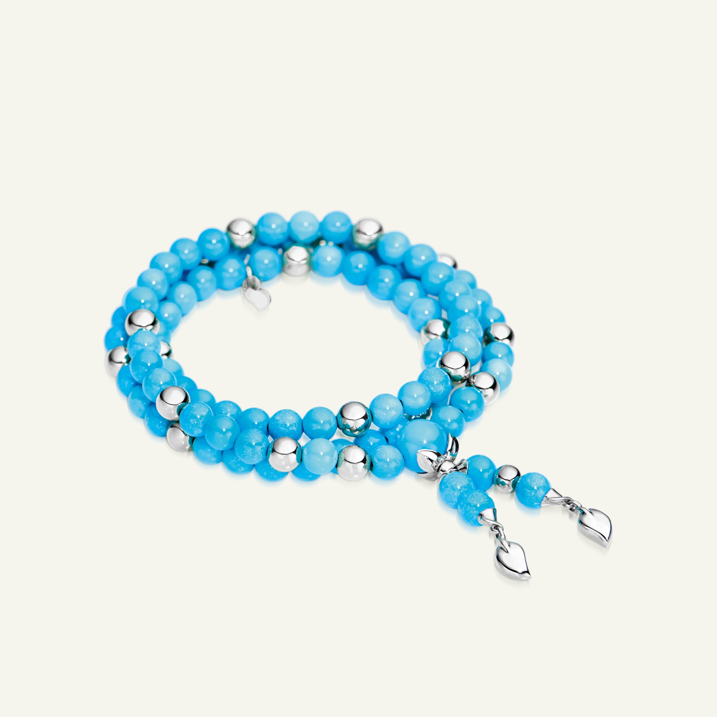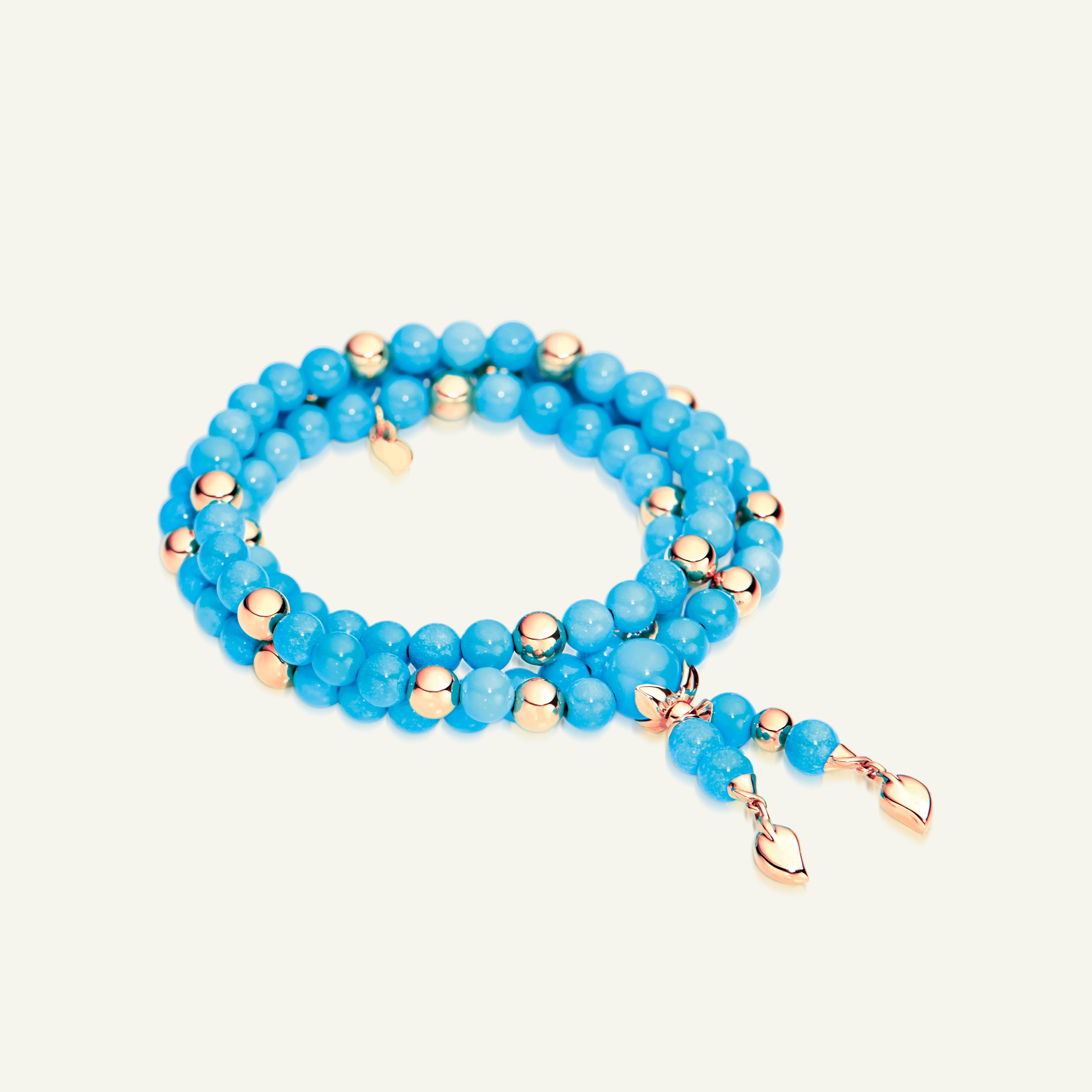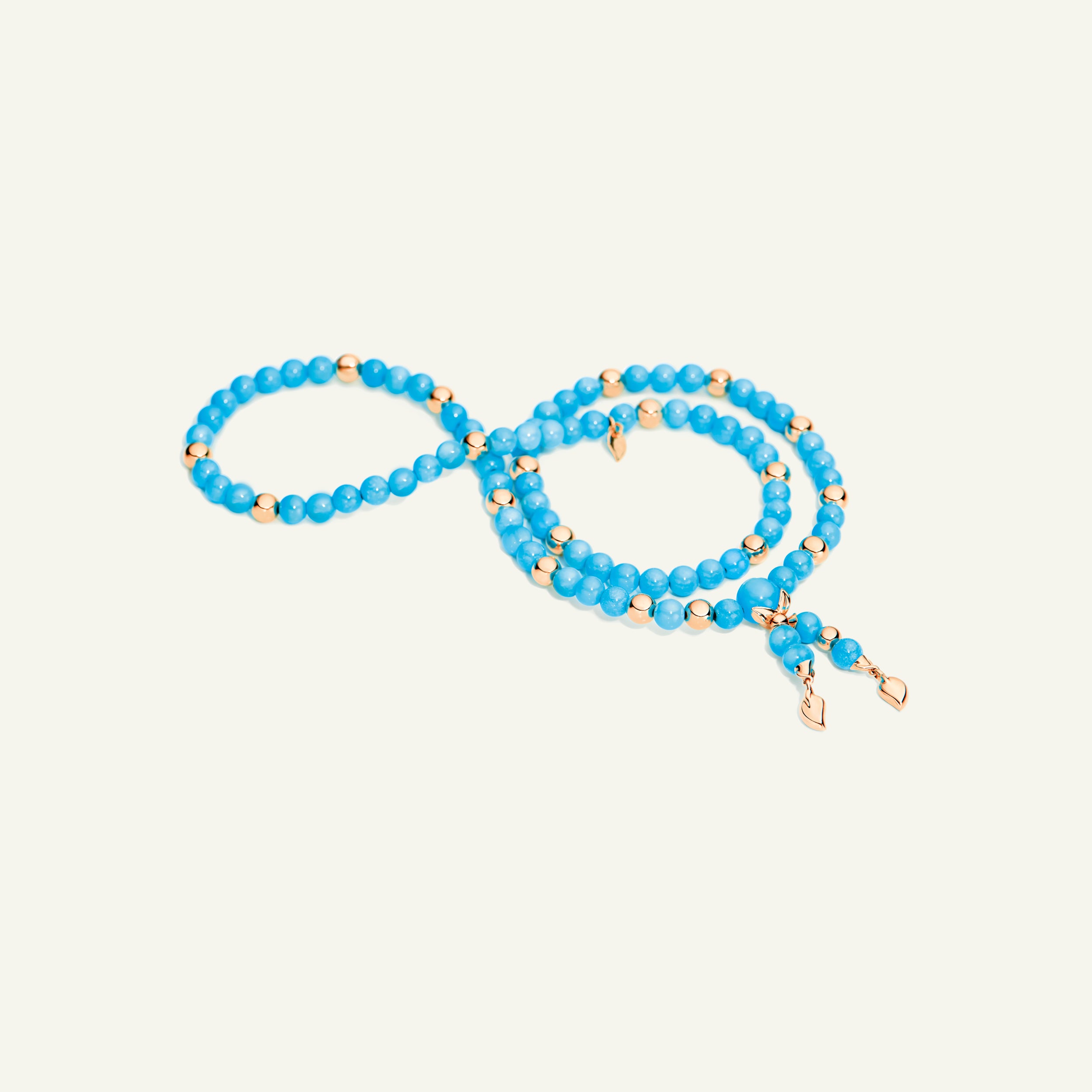 The INDIA Medium Bracelet features polished Turquoise beads, admired for their vibrant blue-green hue and natural character, accented with 18K gold beads and the iconic water drop charms. Strung on elastic for a comfortable fit, this versatile design can be wrapped twice as a bracelet or worn long as a necklace, offering timeless style and a striking statement.