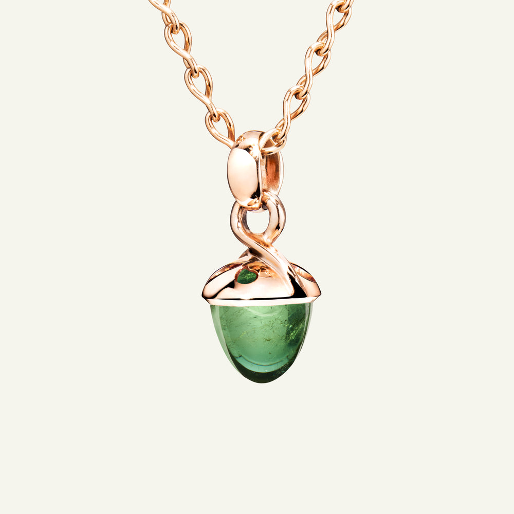 The iconic MIKADO Bouquet Fairy Pendant with green Tourmaline features a lush, earthy gemstone in the signature acorn shape, set in 18K gold. The openwork cap design lets light flow through, enhancing the gemstone’s brilliance and revealing even more of its beauty. A graceful detail within the world of MIKADO collectibles, it’s ideal for mix & match styling, collecting, and gifting.