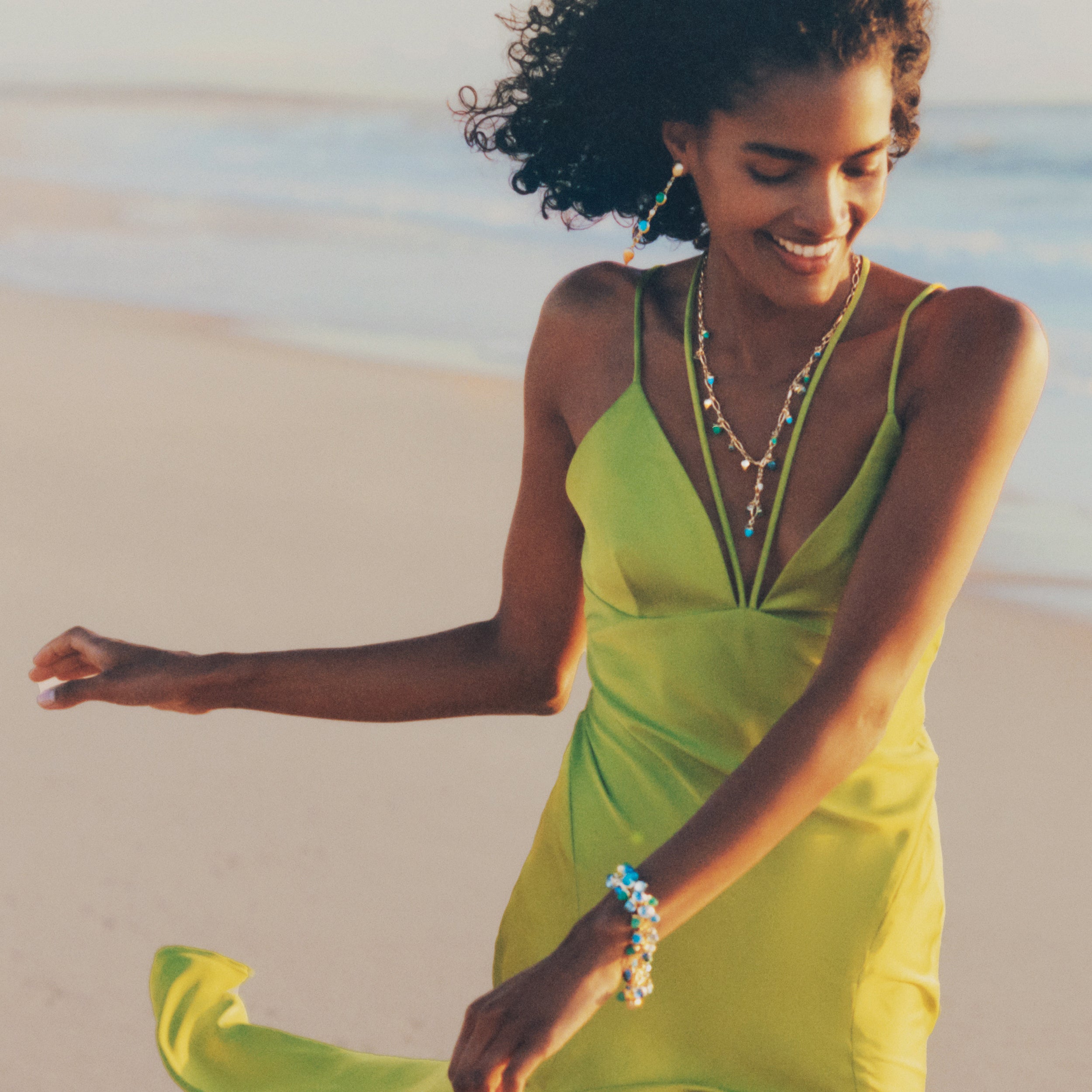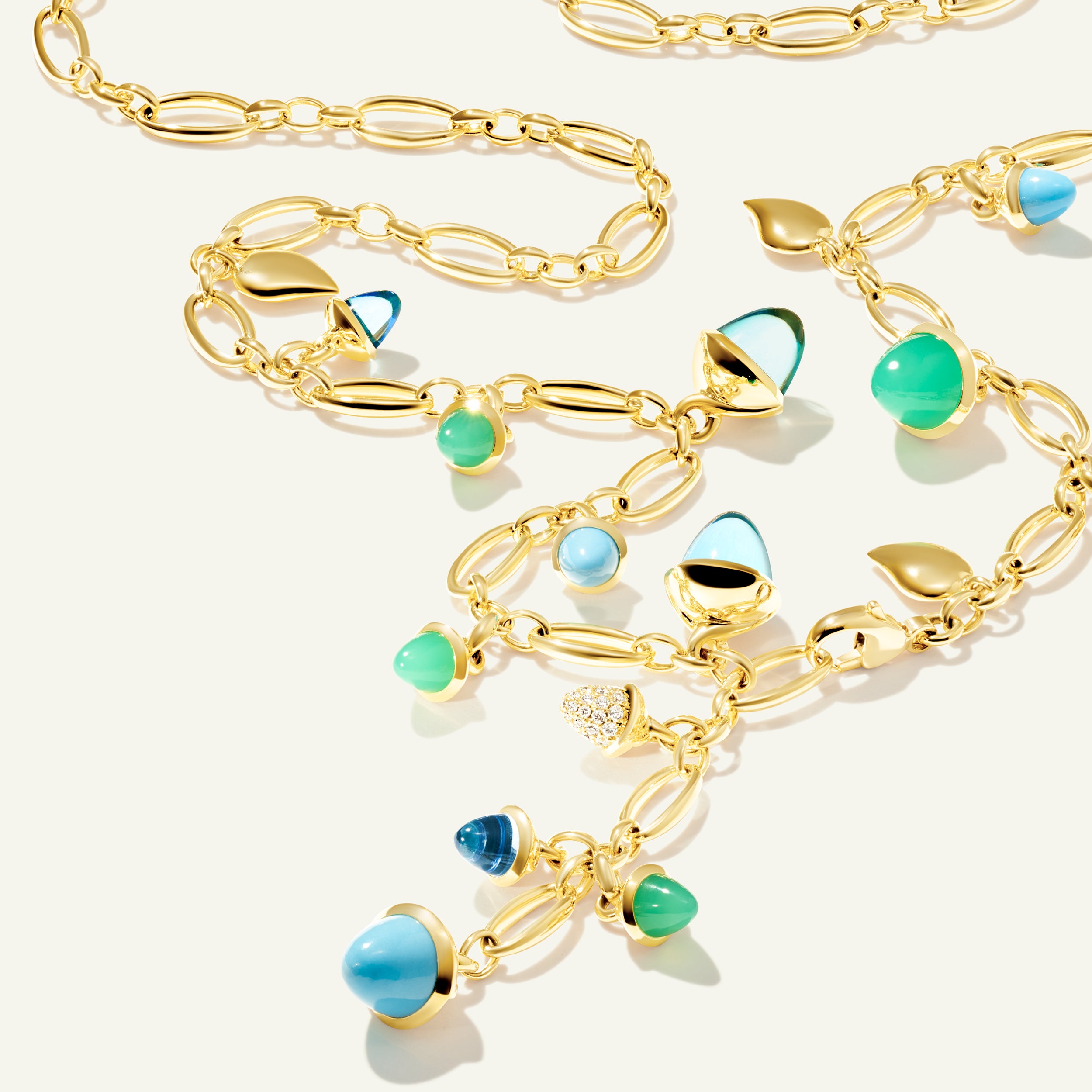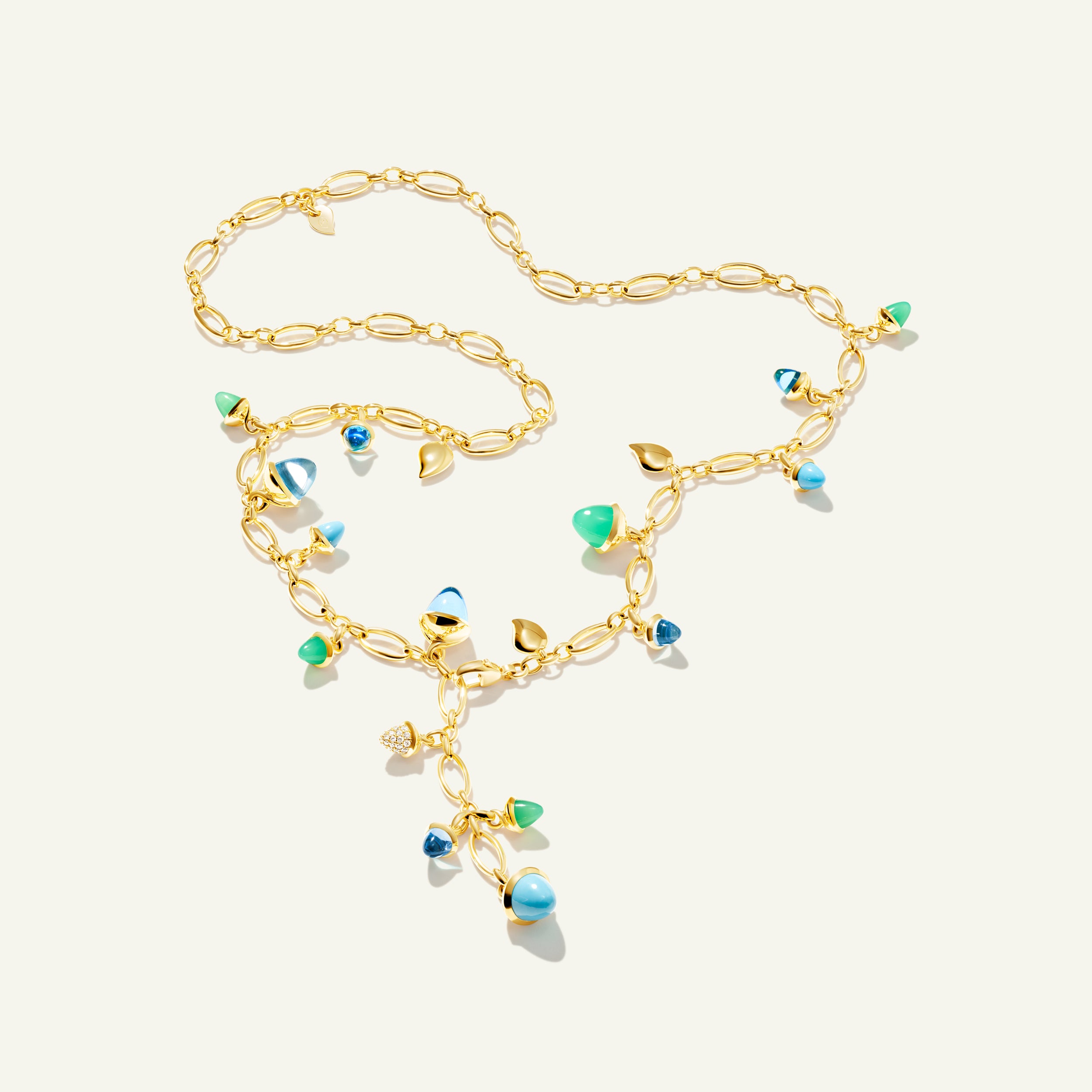 Make a statement with the MIKADO Necklace in ‘Lagoon,’ offering versatile styling options to suit any occasion. A cascade of vibrant blue and green gemstones shimmers on a handcrafted 18K gold chain. Accented with Diamond Pavé and water drop details for a touch of brilliance. Elegant enough for evening, effortless enough for every day.