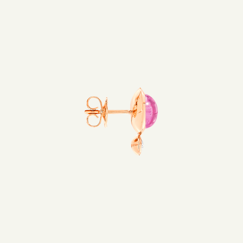 The BOUTON Earrings in 18K gold feature vibrant, rosy pink cabochon-cut Tourmalines paired with a touch of white Diamond sparkle. Designed for versatility, they can be worn with the Diamond dangling downward or positioned up the ear for a different look. A comfortable, classic accessory perfect for everyday wear.