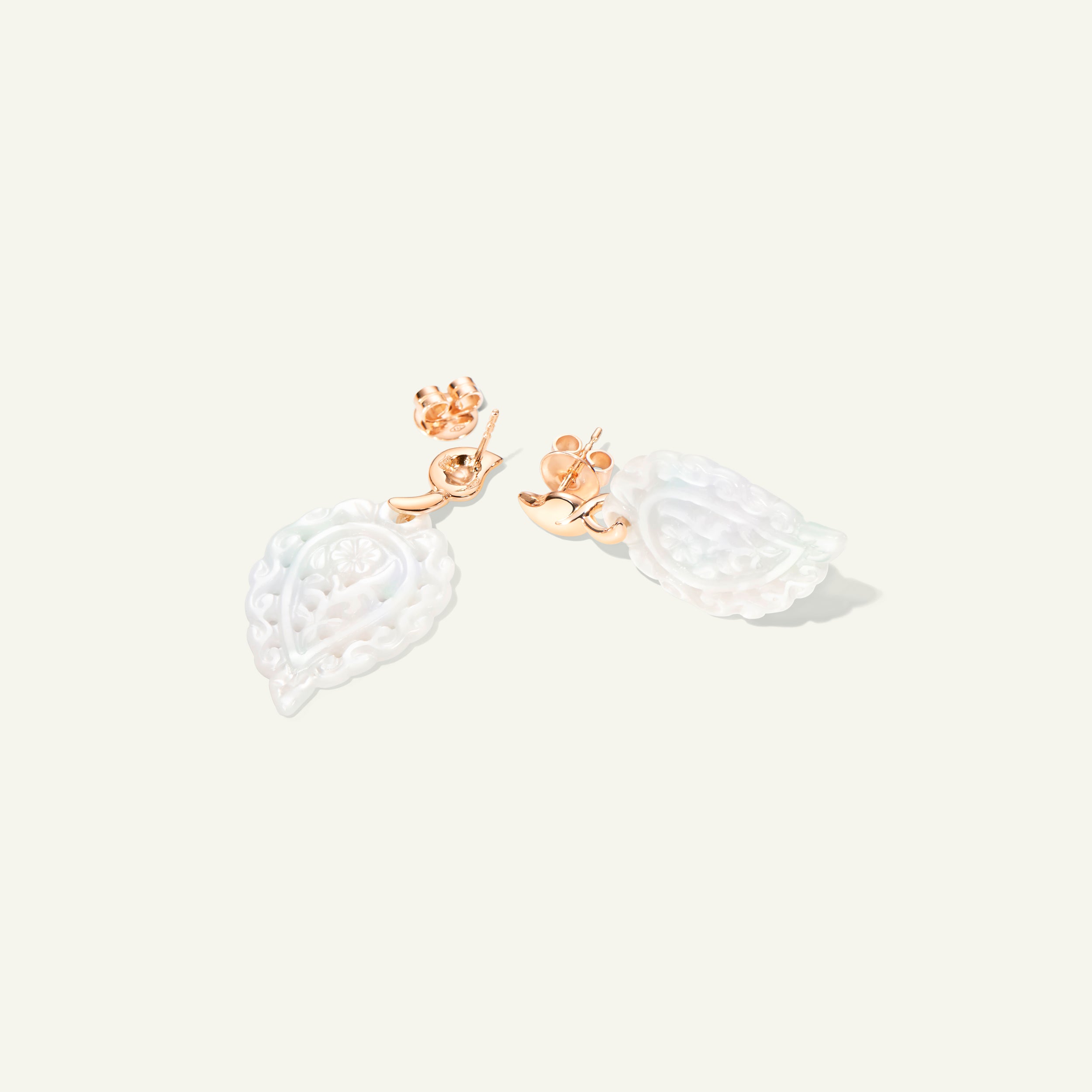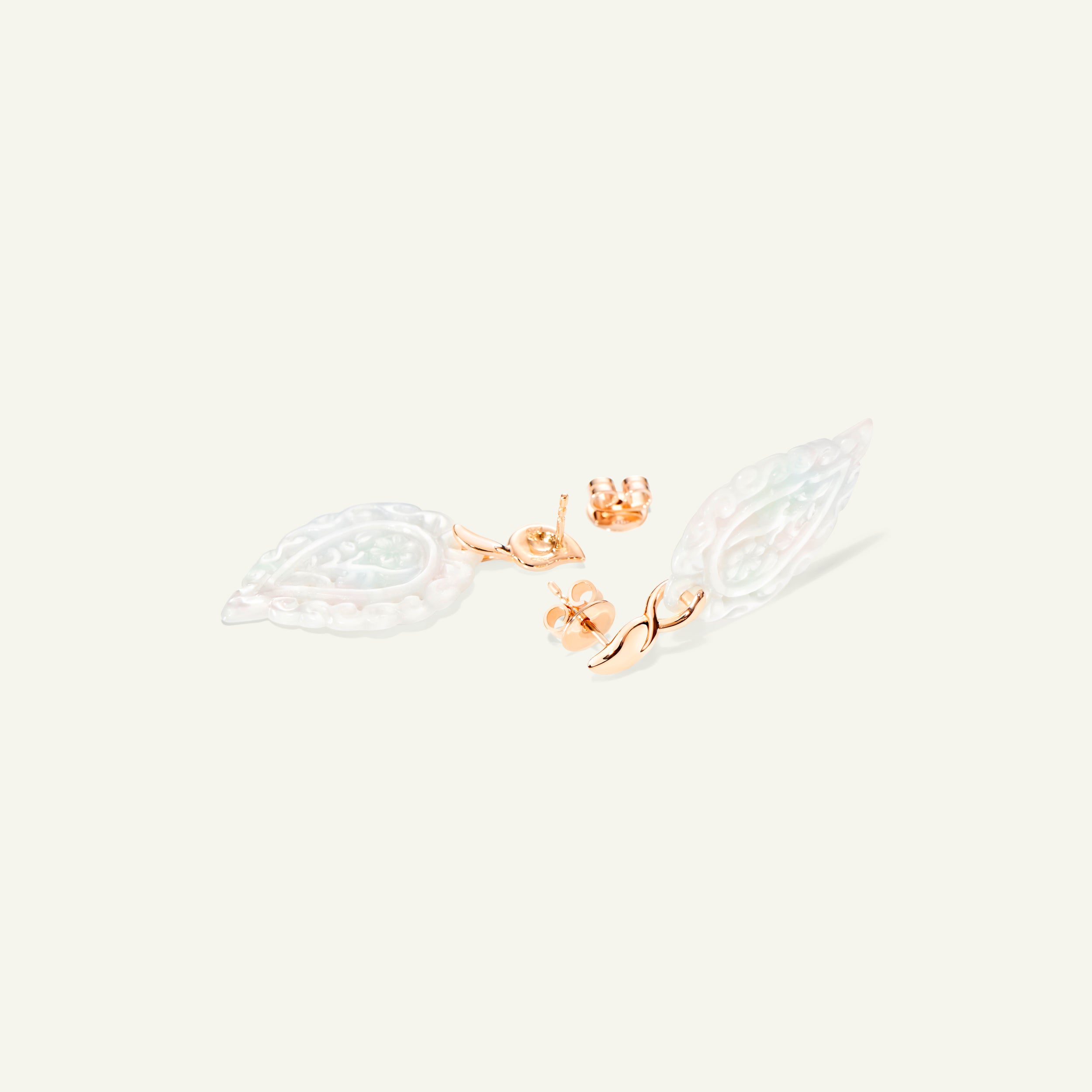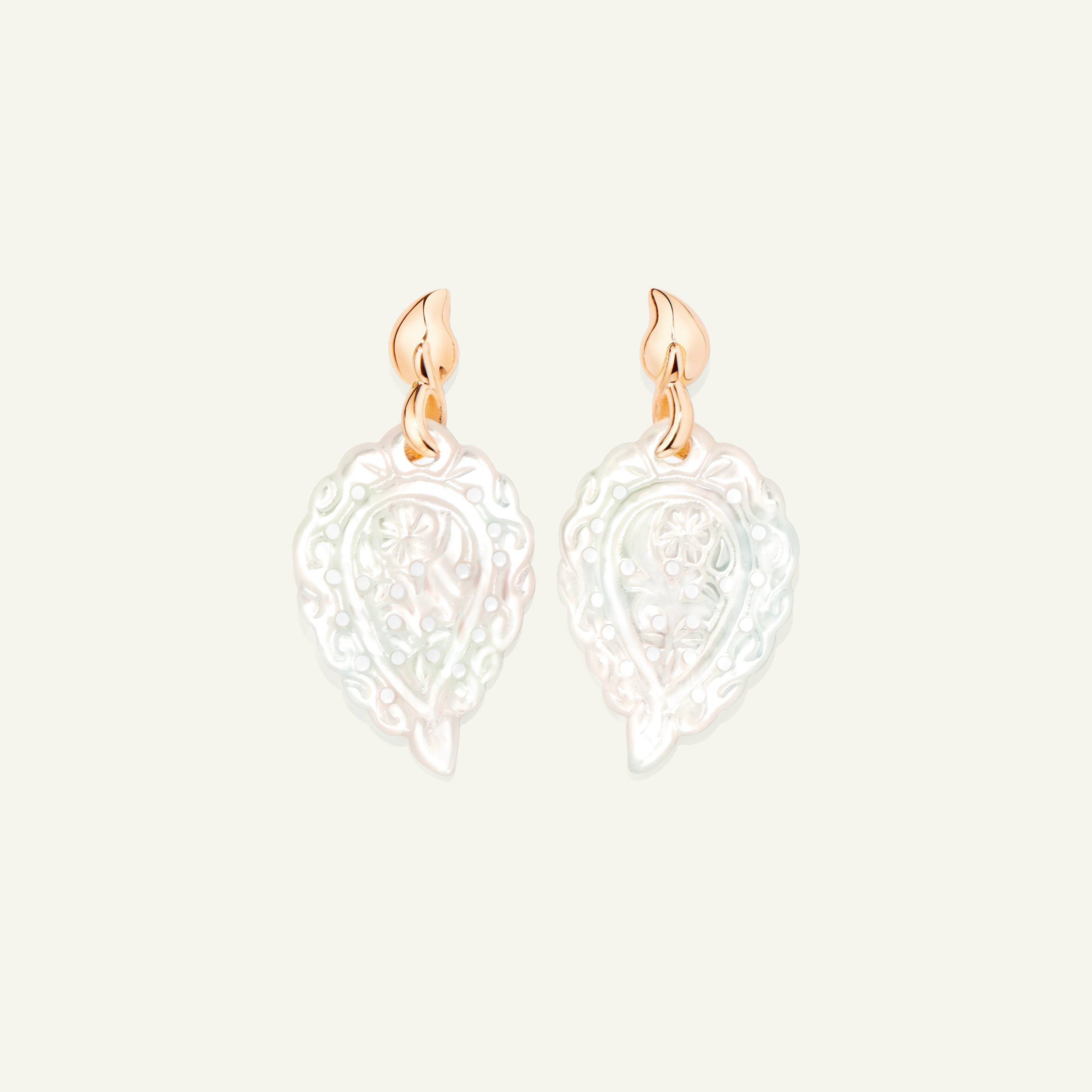 Meticulously handcrafted, the INDIA Earrings in 18K gold feature artfully carved Mother of Pearl leaves, showcasing soft, iridescent tones that frame the face beautifully. Suspended from an iconic drop-shaped stud, these lightweight earrings bring a touch of luminous charm.