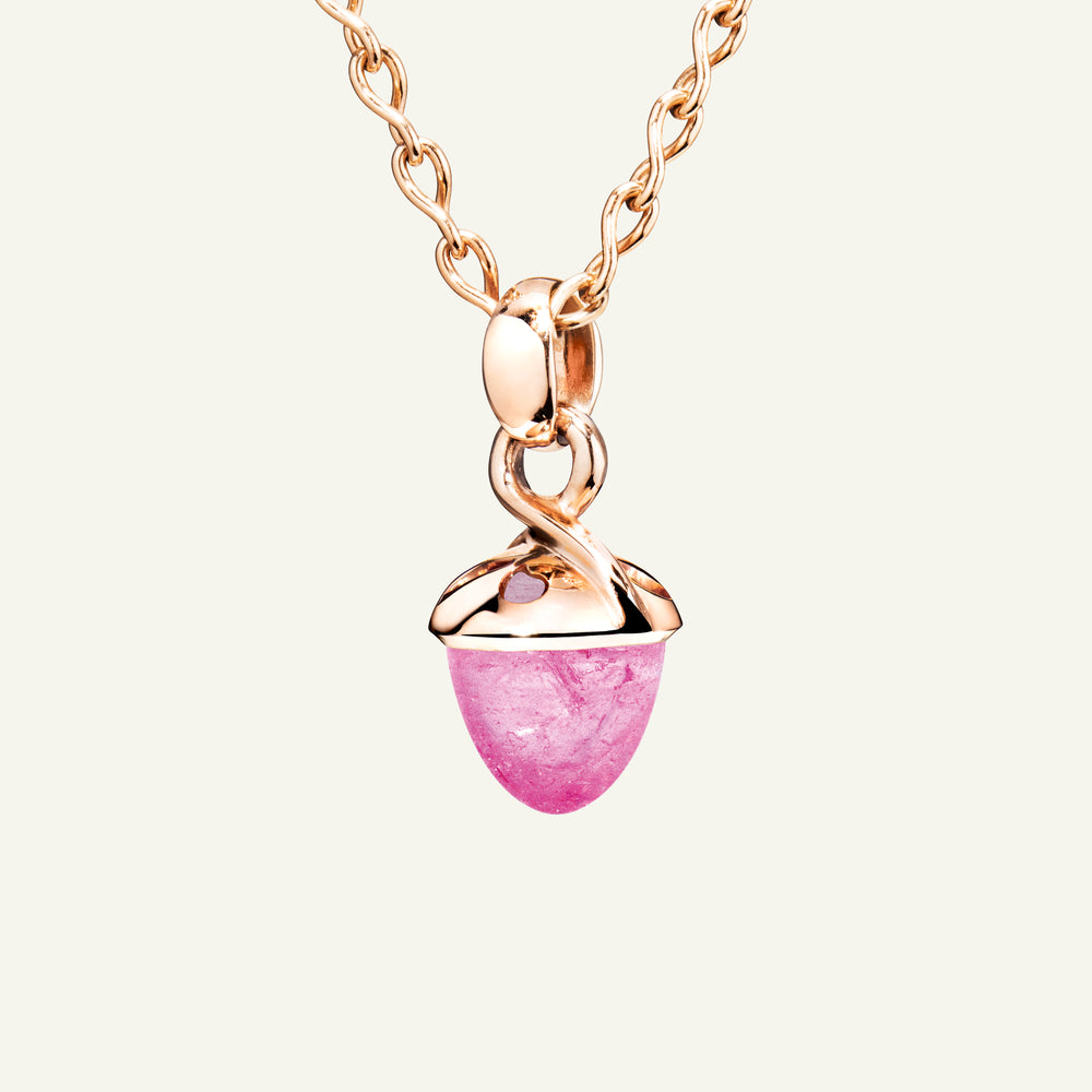 The iconic MIKADO Bouquet Fairy Pendant with Rose Tourmaline features a vibrant, rosy pink gemstone in the signature acorn shape, set in 18K gold. The openwork cap design lets light flow through, enhancing the gemstone’s brilliance and revealing even more of its beauty. A graceful detail within the world of MIKADO collectibles, it’s ideal for mix & match styling, collecting, and gifting.
