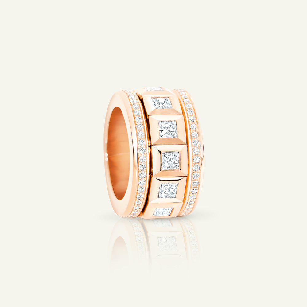 Ein wahrhaft ikonisches Schmuckstück: Der CURRICULUM VITAE Ring ist ein Meisterwerk modernen Designs. Beweglich gefasste Edelsteine im Princess-Cut, umrahmt von Diamant Pavé, eingefasst in 18 Karat Gold, sind so arrangiert, dass sie aus jedem Blickwinkel funkeln. Zeitgenössisch und zugleich zeitlos verkörpert dieser außergewöhnliche Ring höchste Handwerkskunst, pure Eleganz und künstlerischen Ausdruck.