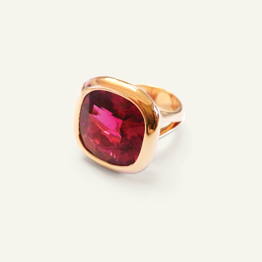 A vibrant Rubellite Tourmaline glows at the center of the CUSHION Ring, prized for its rich pink-red hues and captivating brilliance. The tapered cushion-style band in 18K gold is designed for both elegance and comfort, letting the extraordinary gemstone take the spotlight.