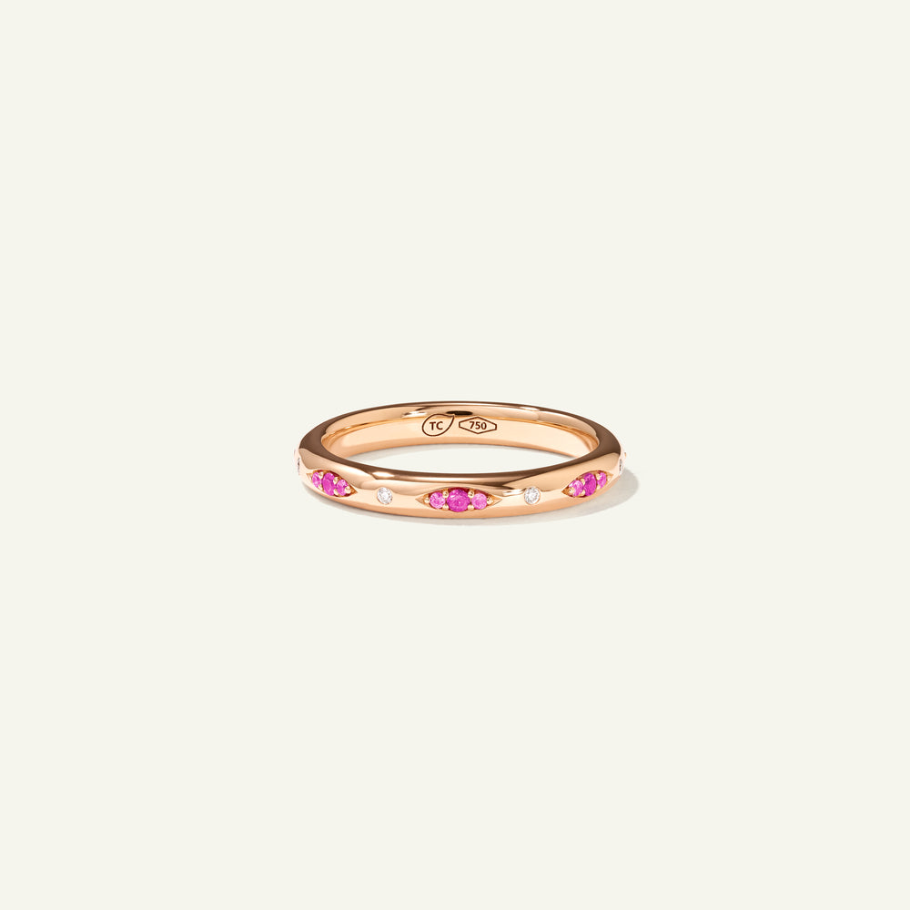 The GYPSY Band Ring in the Color Story ‘Blush’ brings a modern twist to timeless design. Crafted in 18K gold, it shimmers with a delicate pavé of pink sapphires and brilliant-cut white diamonds. This versatile ring is perfect for stacking, mixing, & matching to create looks that range from classic elegance to bohemian charm.