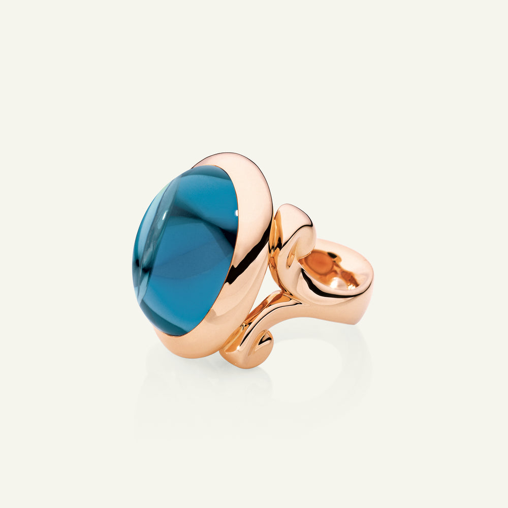 The HIPPIE GLAM Small Ring features a smooth cabochon London Topaz set in 18K gold. Its organic shape brings laid-back elegance to everyday wear. This versatile ring layers beautifully or makes a modern statement on its own.