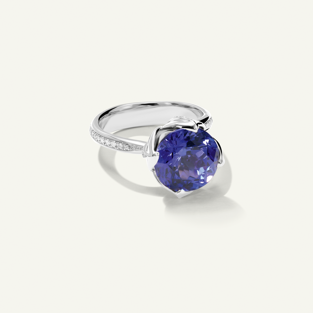 Mit einem 5 ct rund facettierten violett-blauen Tansanit sowie ca. 0,16 ct Diamant-Pavé in feiner Qualität (F/vs).
