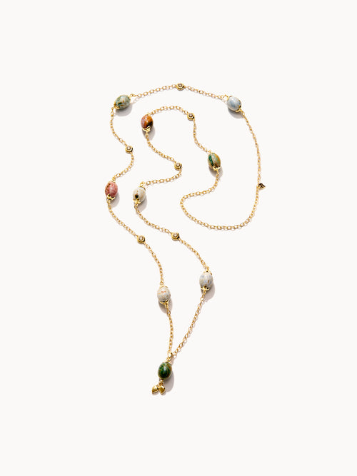 Die OCEAN JASPER Halskette fasziniert mit ihrer natürlichen Ästhetik: Die aus Madagaskar stammenden Steine sind absolut einzigartig – keiner gleicht dem anderen. Vollendet wird das Design durch edle Akzente aus champagnerfarbenen Diamanten.