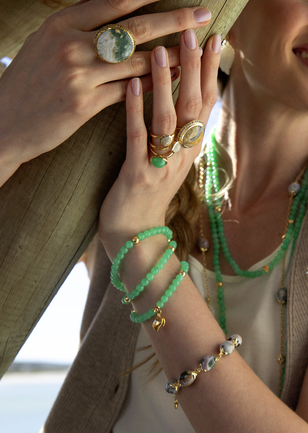 Tiefgründig und elegant: Namibischer Malachit lässt sich vielseitig kombinieren und passt sich mühelos jeder Saison an – ob lässig oder edel gestylt.