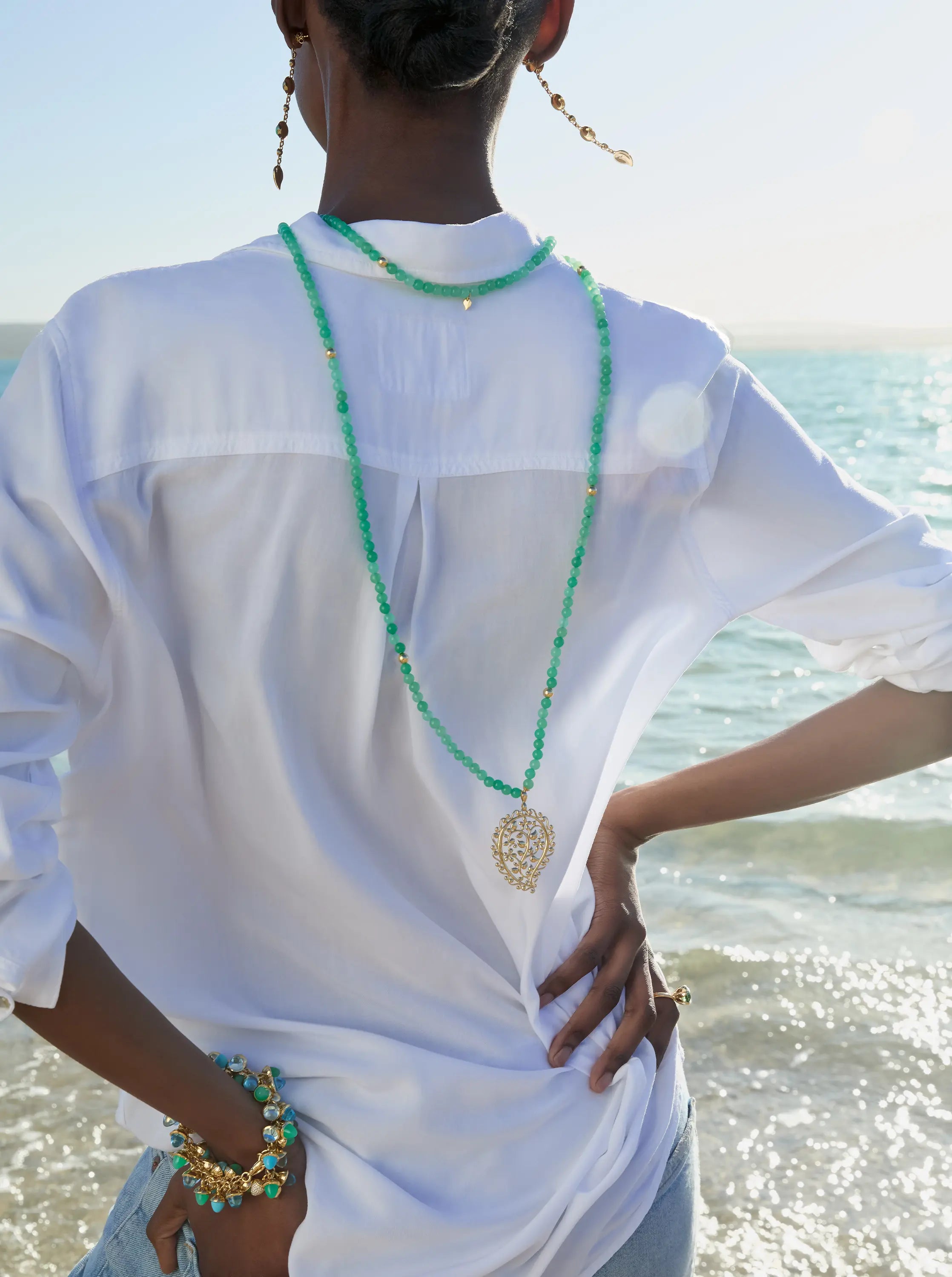 Leuchtend, erfrischend schön und vielseitig: Polierte Perlen aus afrikanischem Chrysopras zieren diese Special Edition-Schmuckstücke, die in extralangen Versionen erhältlich sind und auf vielfältige Weise gestylt werden können.