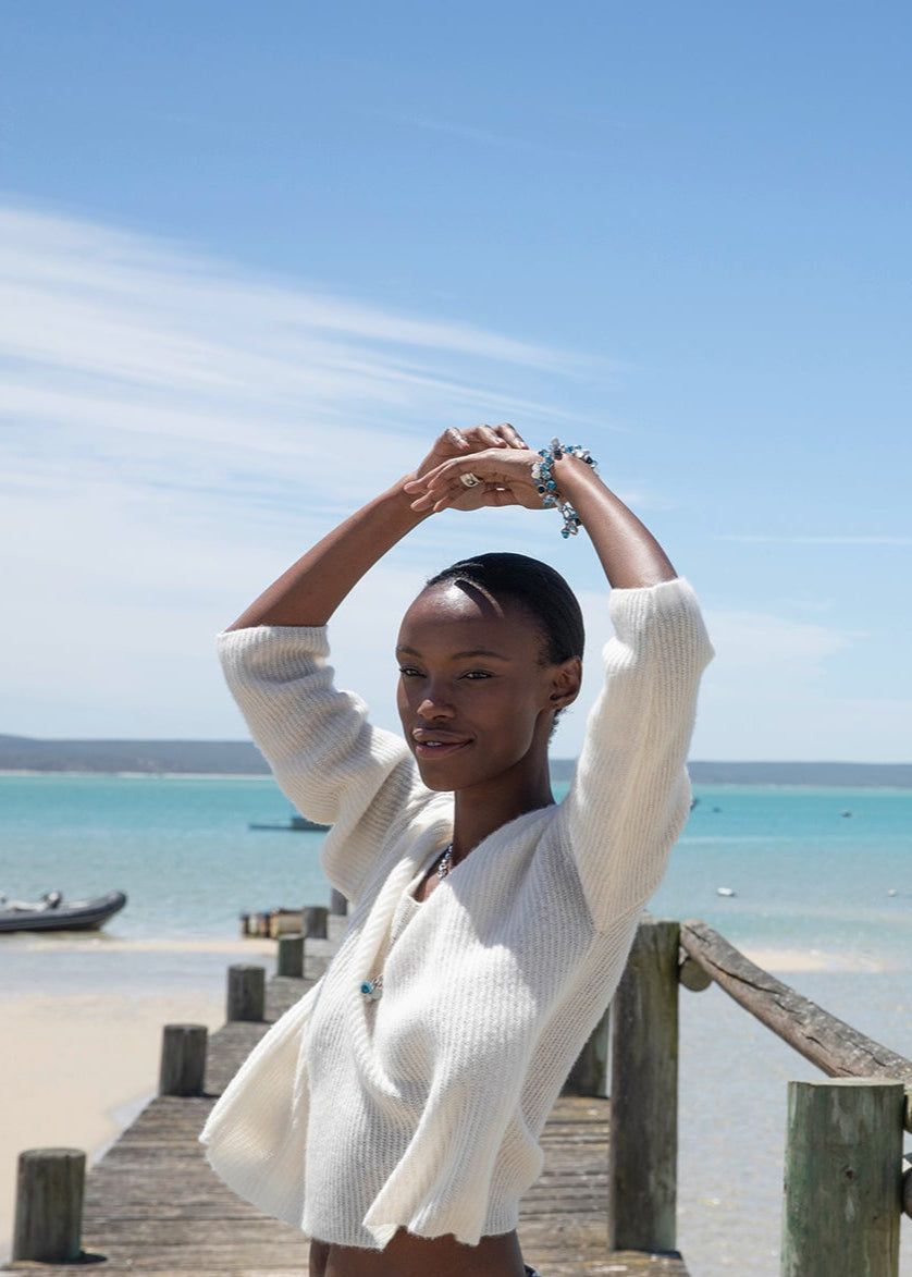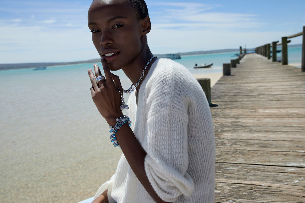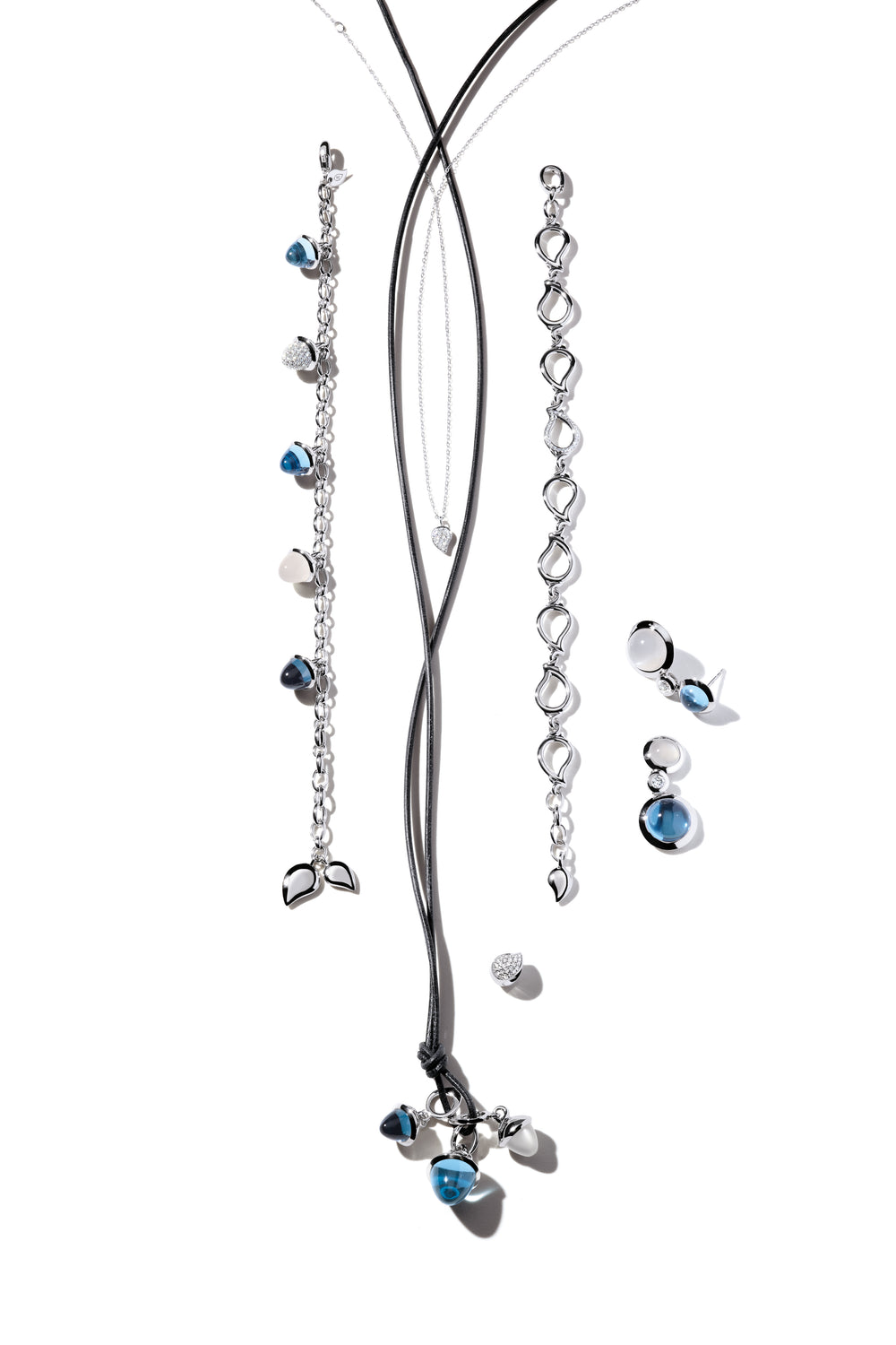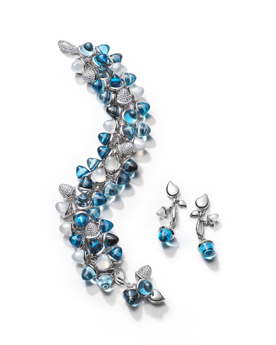 Im Spiel mit kühlen Tönen verzaubert 'Ocean' durch die Kombination von schimmernden Mondsteinen mit einzigartiger Tiefe, funkelnden Diamanten, tiefblauem Topas und 18K Weißgold.