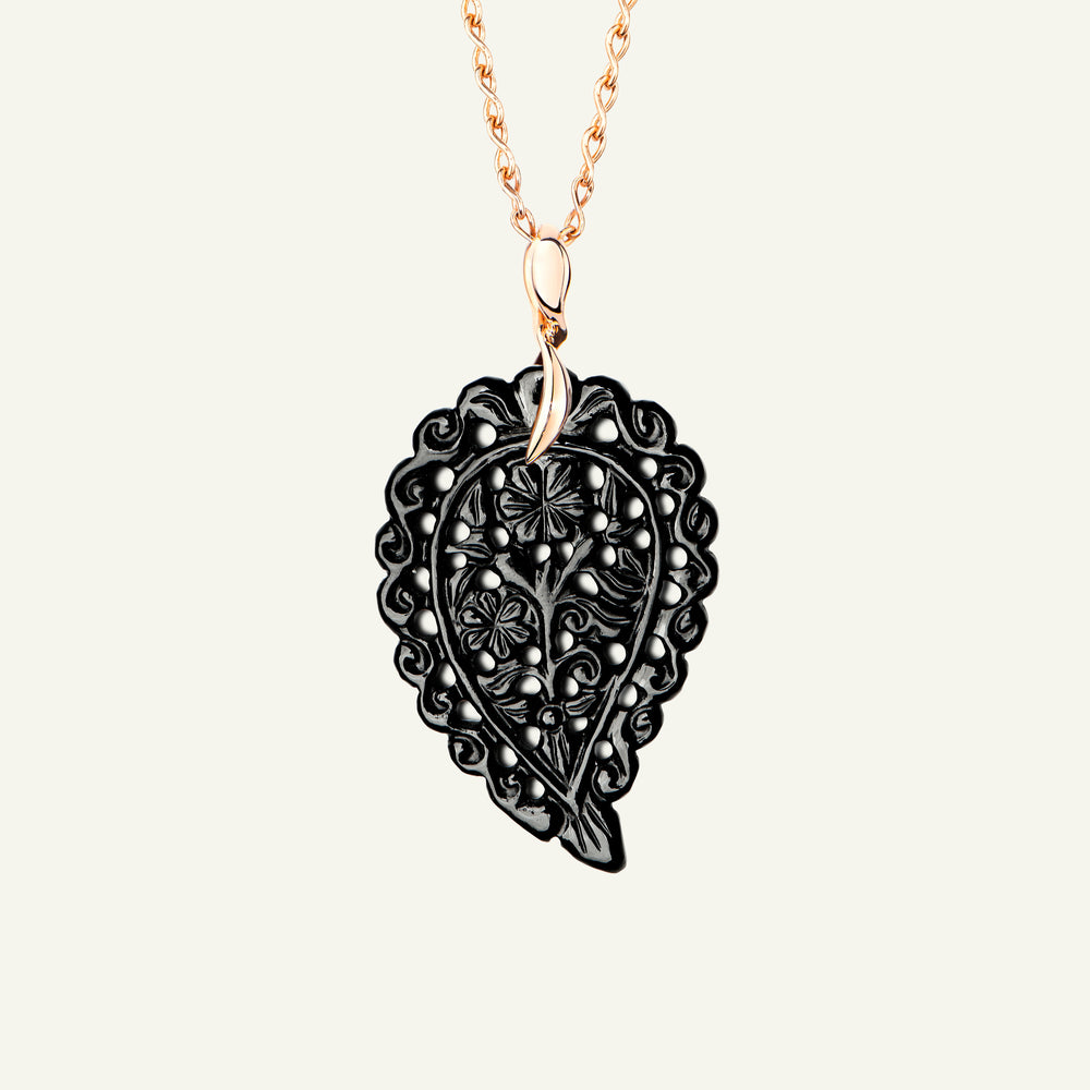 Der INDIA Medium Anhänger aus 18 Karat Gold präsentiert kunstvoll geschnitzten schwarzen Onyx, dessen tiefdunkle, polierte Töne in einer eleganten Blattform zur Geltung kommen. Für das zarte Schwingen an einer Kette entworfen, ist er ein markanter Alltagsfavorit, der jedem Look einen Hauch von Raffinesse verleiht – perfekt, um einem Layering-Style zusätzliche Dimension zu geben.