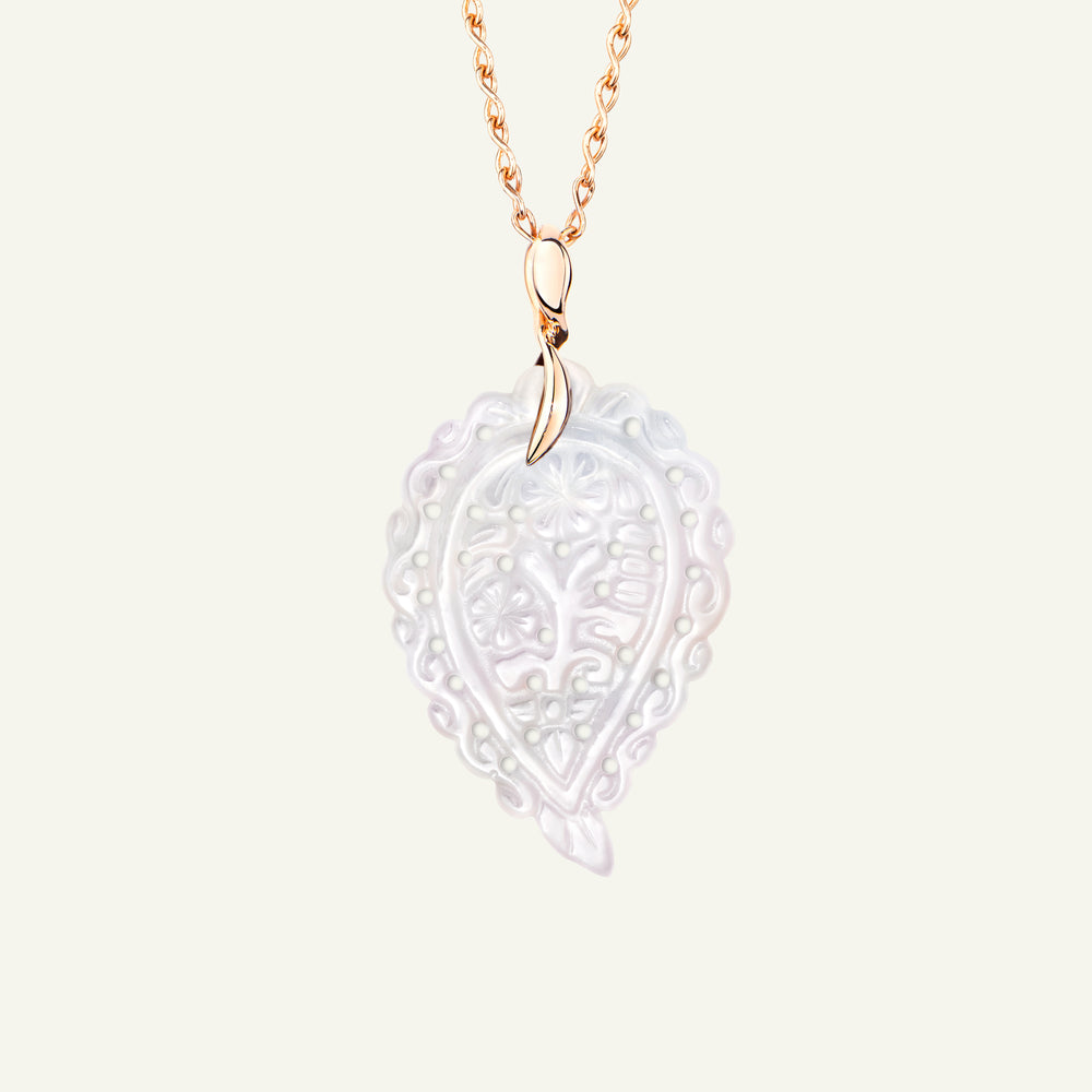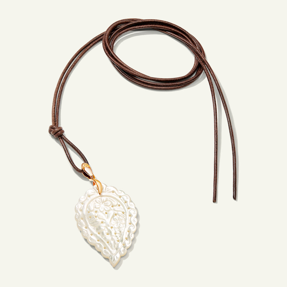 Der INDIA Medium Anhänger aus 18 Karat Gold präsentiert kunstvoll geschnitztes Perlmutt, dessen sanfte, irisierende Töne in einer eleganten Blattform zur Geltung kommen. Für das zarte Schwingen an einer Kette entworfen, ist er ein wunderschöner Alltagsfavorit, der jedem Look einen Hauch von Raffinesse verleiht – perfekt, um einem Layering-Style zusätzliche Dimension zu geben.