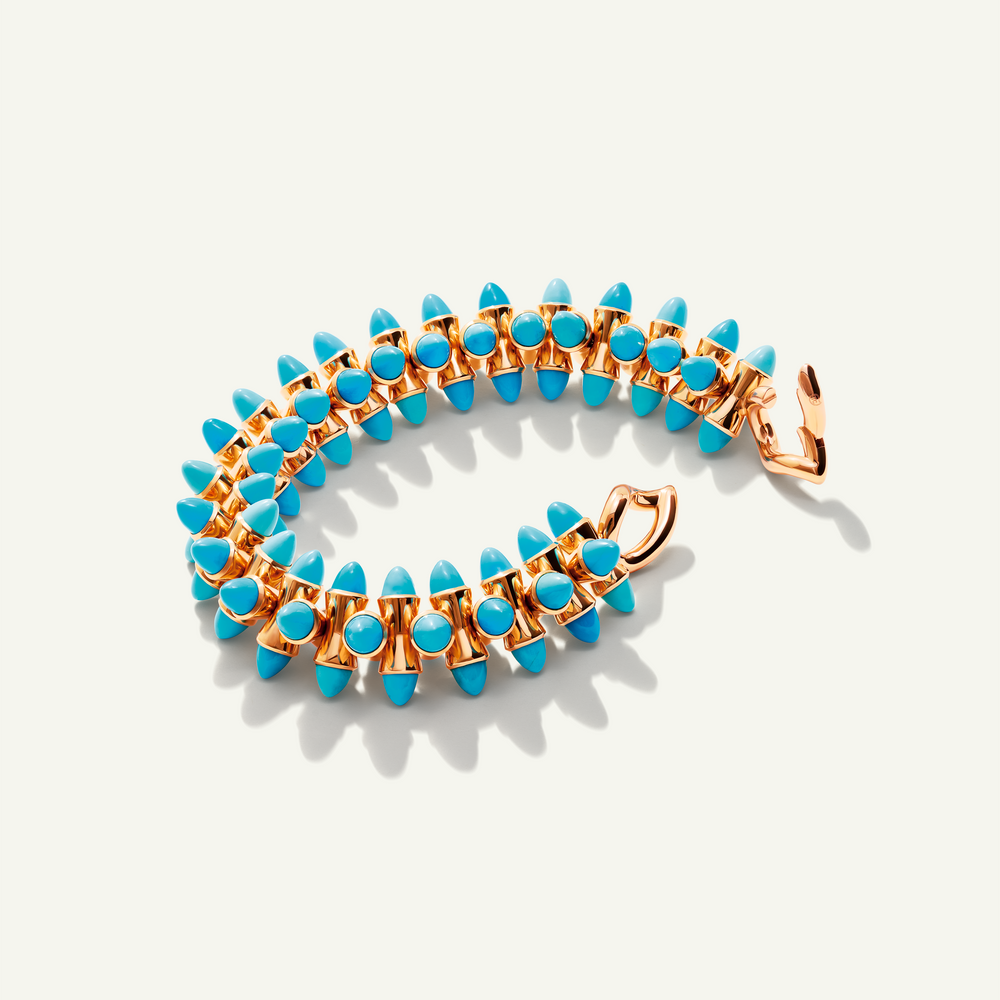Das MIKADO Armband in der Color Story ‘Turquoise‘ vereint eine frische Mischung aus blau-grünen Edelsteinen mit feinen Wassertropfen-Details. In aufwendiger Handarbeit aus 18 Karat Gold gefertigt, verleiht dieses ausdrucksstarke Schmuckstück spielerische Bewegung und mühelose Eleganz – perfekt für jeden Anlass.