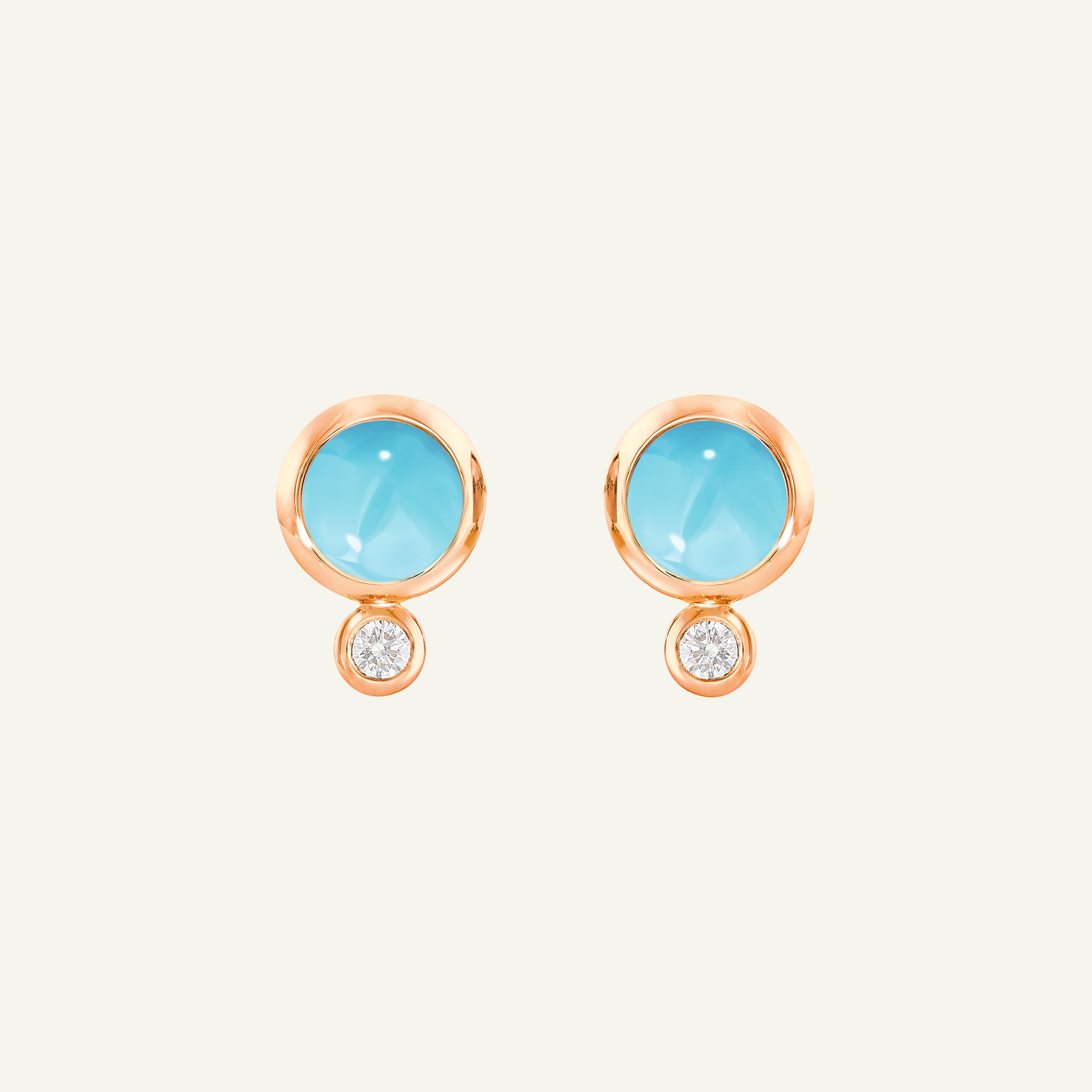 Die BOUTON Ohrringe aus 18 Karat Gold präsentieren strahlend blau-grüne, cabochon-geschliffene Edelsteine, kombiniert mit einem Hauch funkelnder weißer Diamanten. Für vielseitiges Styling entworfen, können sie wahlweise mit dem Diamanten nach unten schwingend oder entlang des Ohrs getragen werden. Ein komfortables, klassisches Accessoire, das sich perfekt für den Alltag eignet.