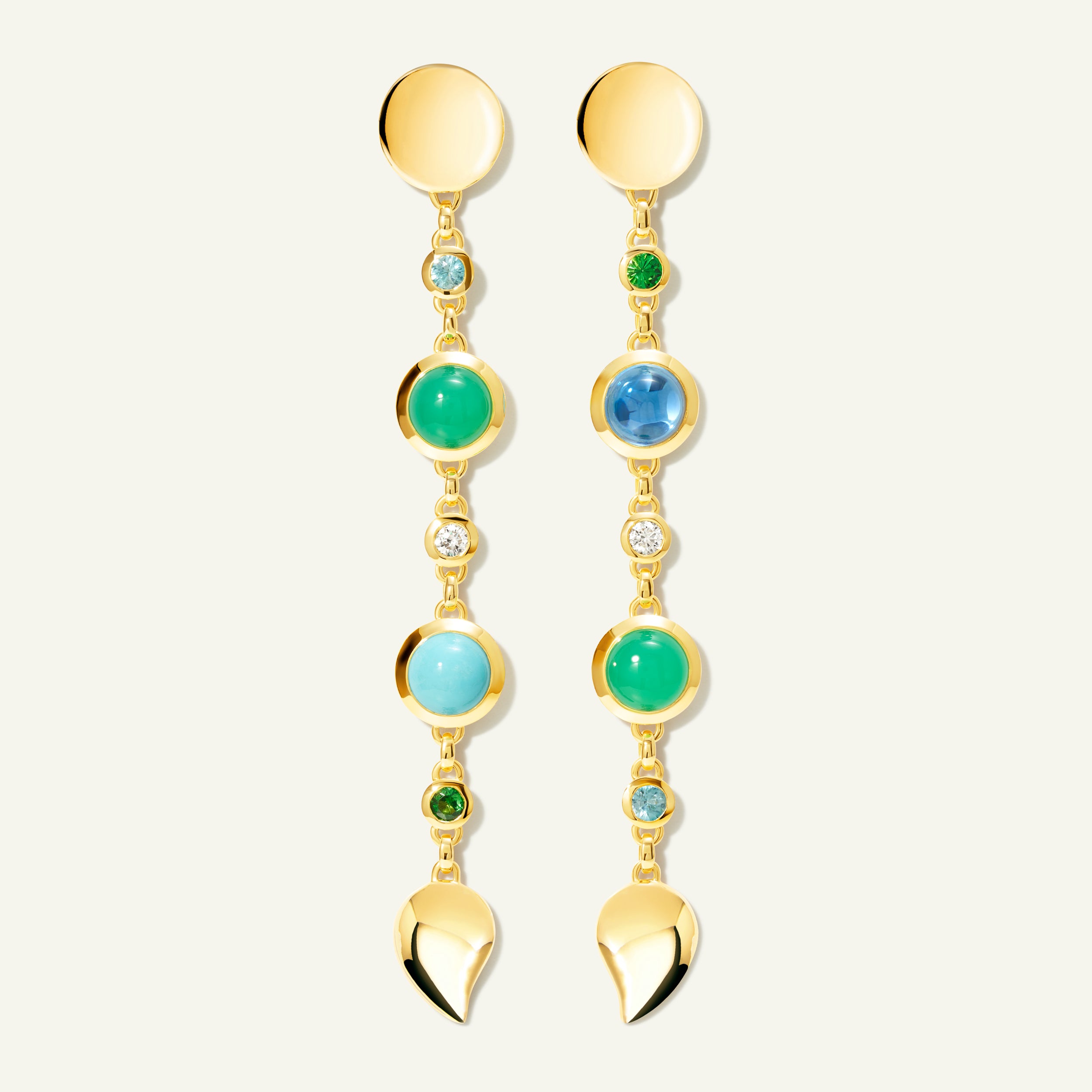 2x weiße Diamanten (je ca. 0,14 ct, G/si), 2x Tsavorit (je ca. 0,2 ct), 2x Zirkon blau (je ca. 0,25 ct);