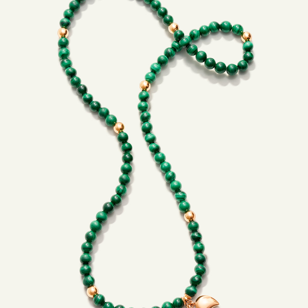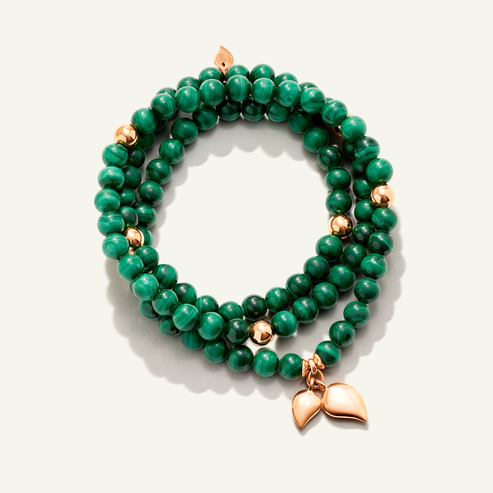 Das INDIA Medium Armband besteht aus poliertem namibischem Malachit, einem tiefgrünen Edelstein, akzentuiert durch 18 Karat Goldperlen und die ikonischen Wassertropfen-Charms. Auf elastischem Band aufgezogen, lässt sich dieses vielseitige Design dreifach ums Handgelenk wickeln oder lang als Halskette tragen – für zeitlosen Stil und ein ausdrucksstarkes Statement.