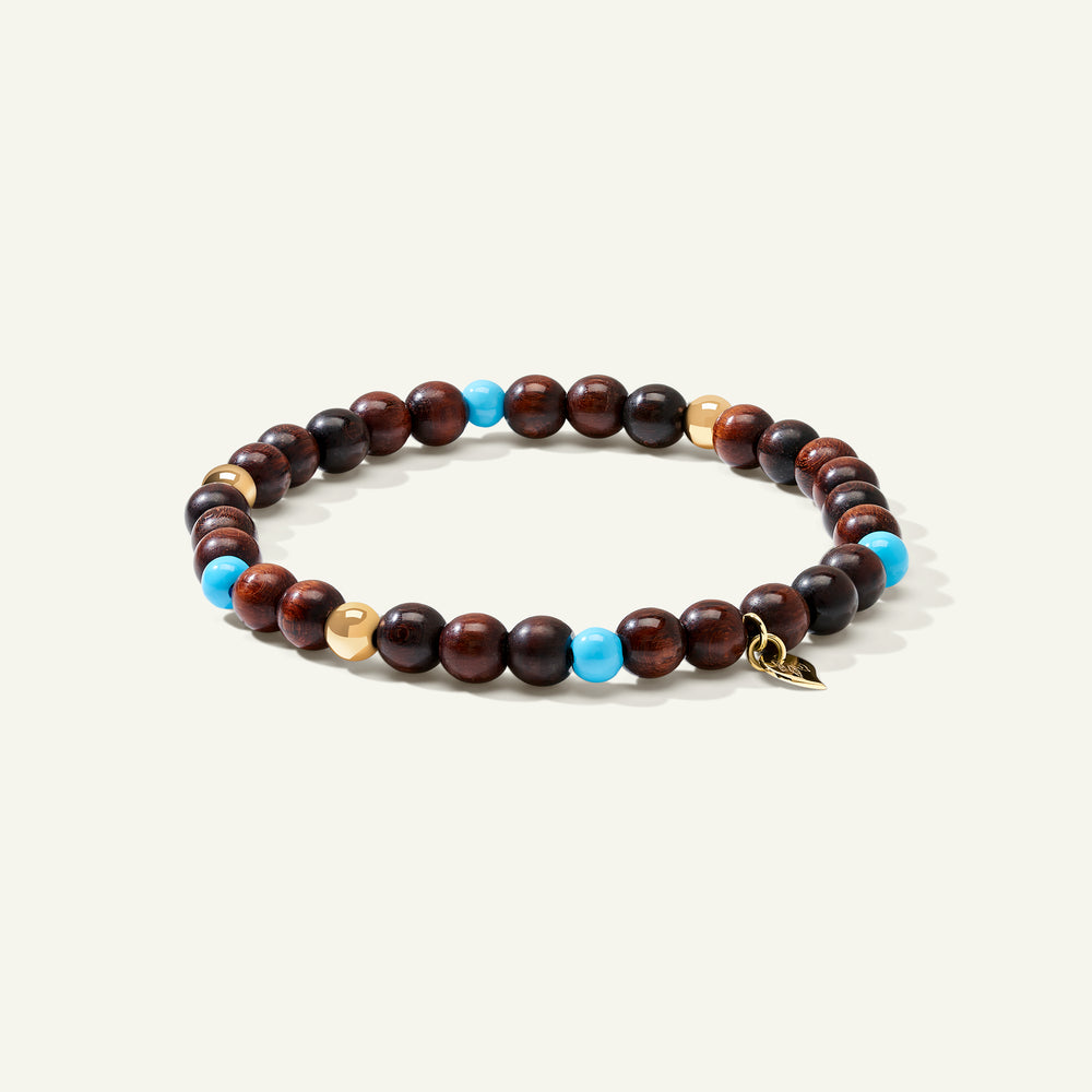 Das INDIA Medium Armband besteht aus ausdrucksstark gemasertem Schlangenholz in Kombination mit leuchtendem Türkis, akzentuiert durch 18 Karat Goldperlen und die ikonischen Wassertropfen-Charms. Dank des elastischen Designs lässt es sich leicht anlegen und bietet einen entspannten, komfortablen Sitz.