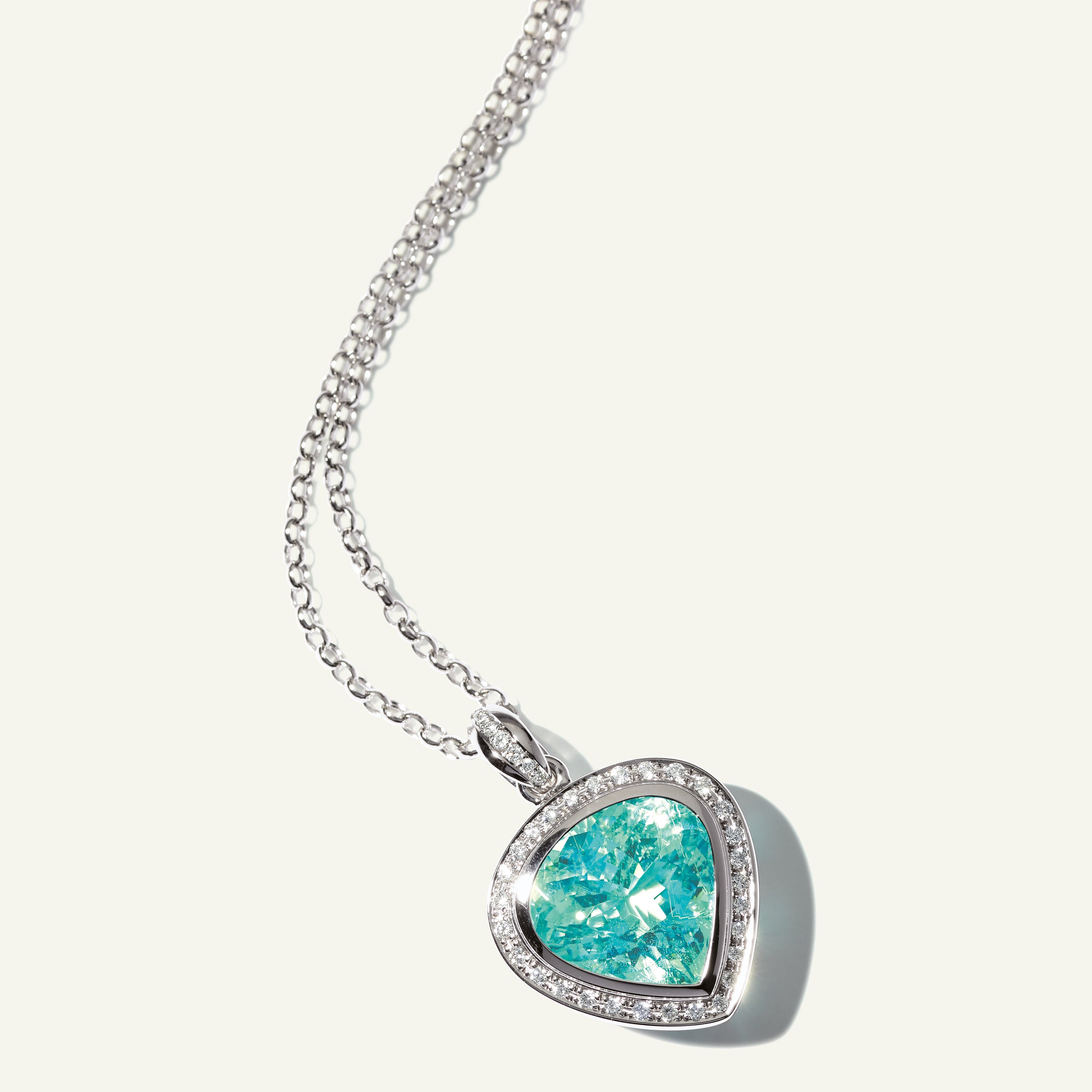 Dieser GLAMOUR Anhänger präsentiert einen seltenen Paraiba Turmalin im Tropfenschliff mit einem leuchtend grünlich-blauen Farbton – ein wahres Sammlerstück. Der Edelstein stammt aus Mosambik und wurde von einem weltweit renommierten Gemmologen geschliffen. Gefasst in 18 Karat Gold mit einem charakteristischen Drop-Design auf der Rückseite und akzentuiert von funkelndem Diamond Pavé, besticht er durch seine außergewöhnliche Farbe und Größe – ein einzigartiges Wunder der Natur.
