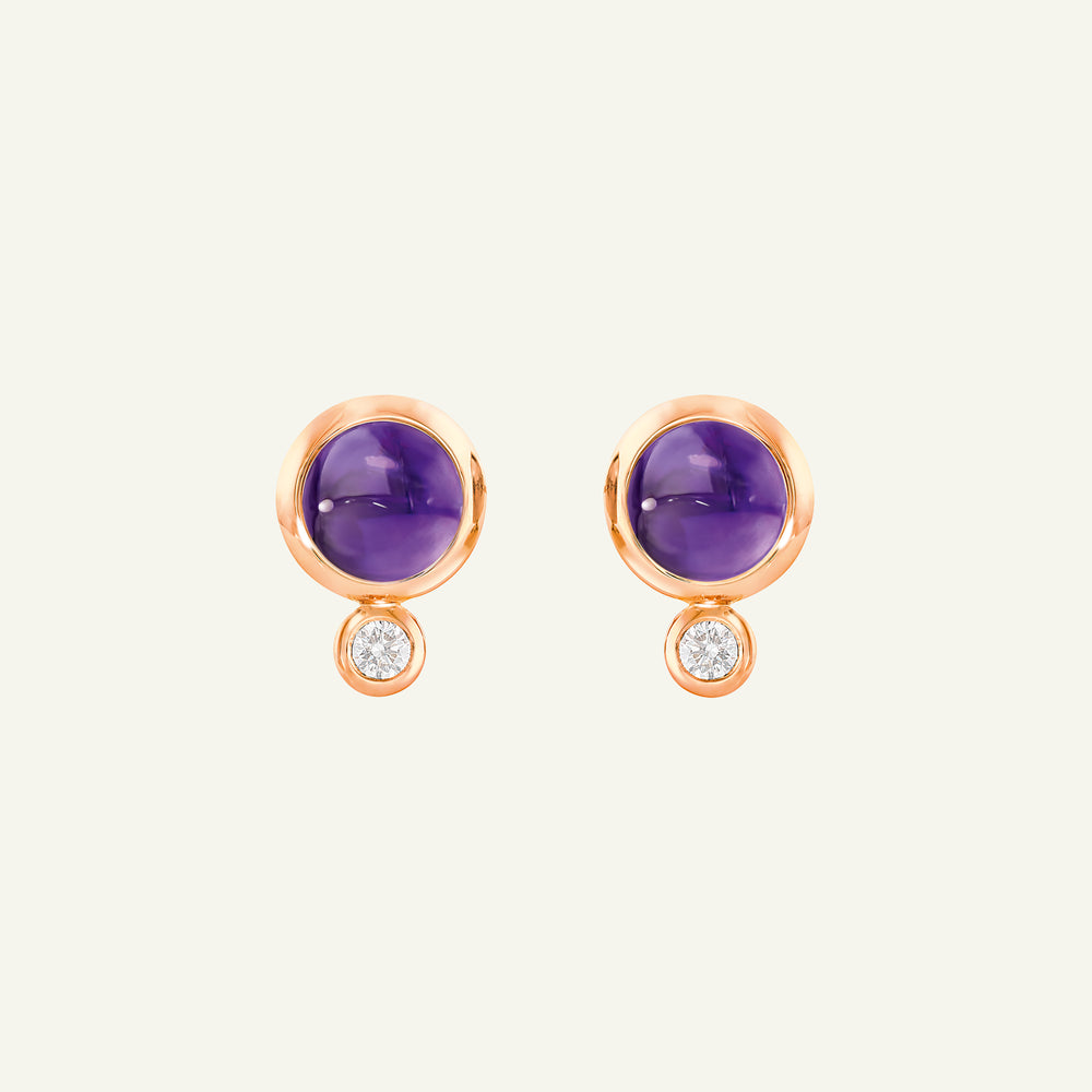 Die BOUTON Ohrringe aus 18 Karat Gold präsentieren leuchtend violette Edelsteine, kombiniert mit einem Hauch funkelnder weißer Diamanten. Für vielseitiges Styling entworfen, können sie wahlweise mit dem Diamanten nach unten schwingend oder entlang des Ohrs getragen werden. Ein komfortables, klassisches Accessoire, das sich perfekt für den Alltag eignet.