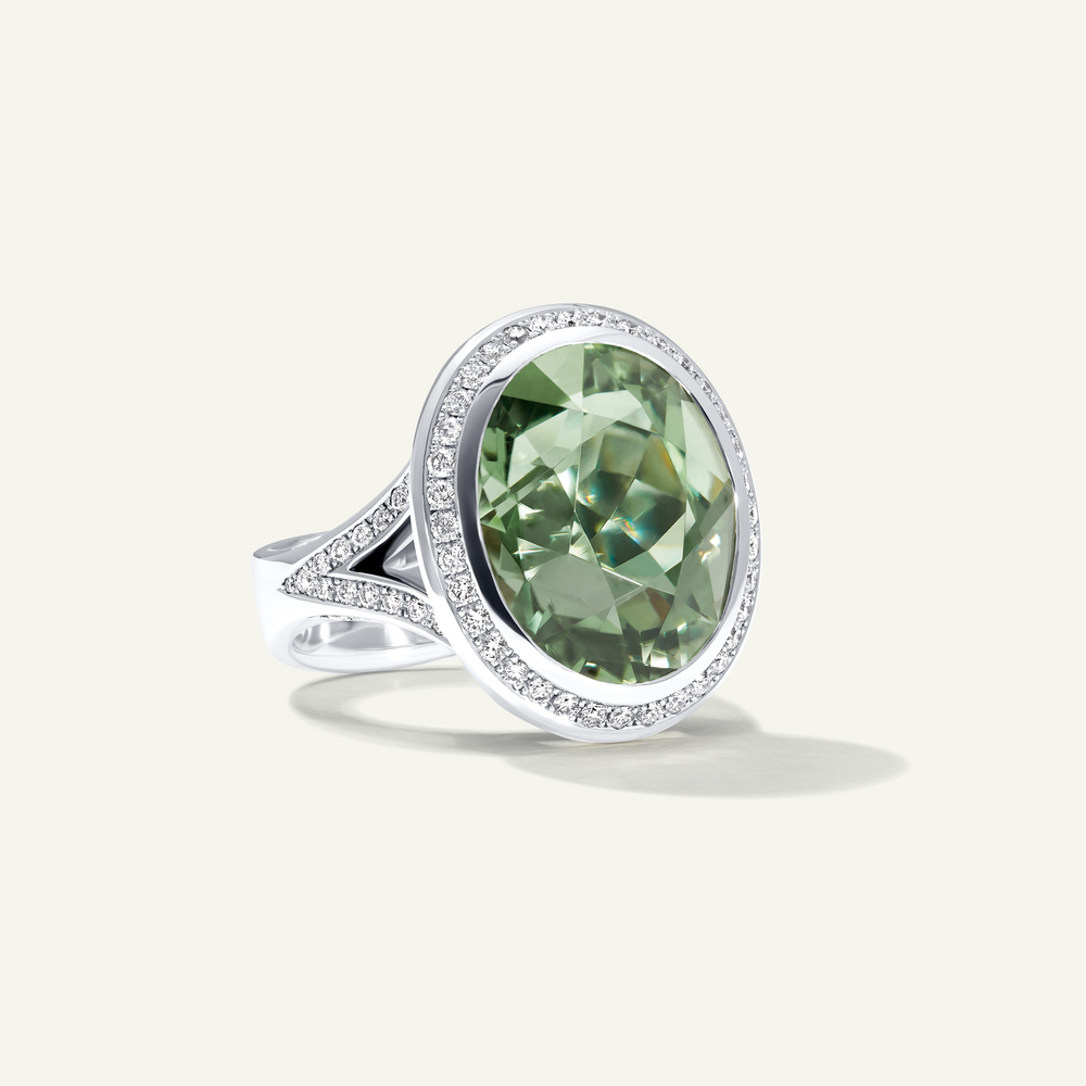 Ein leuchtend grüner Turmalin erstrahlt im Zentrum des CUSHION Rings, geschätzt für seine erfrischende Brillanz und natürliche Farbtiefe. Akzentuiert durch Diamond Pavé an Fassung und Ringschiene, vereint das sanft zulaufende Cushion-Design Eleganz und Tragekomfort und rückt die lebendige Schönheit des Edelsteins in den Mittelpunkt.