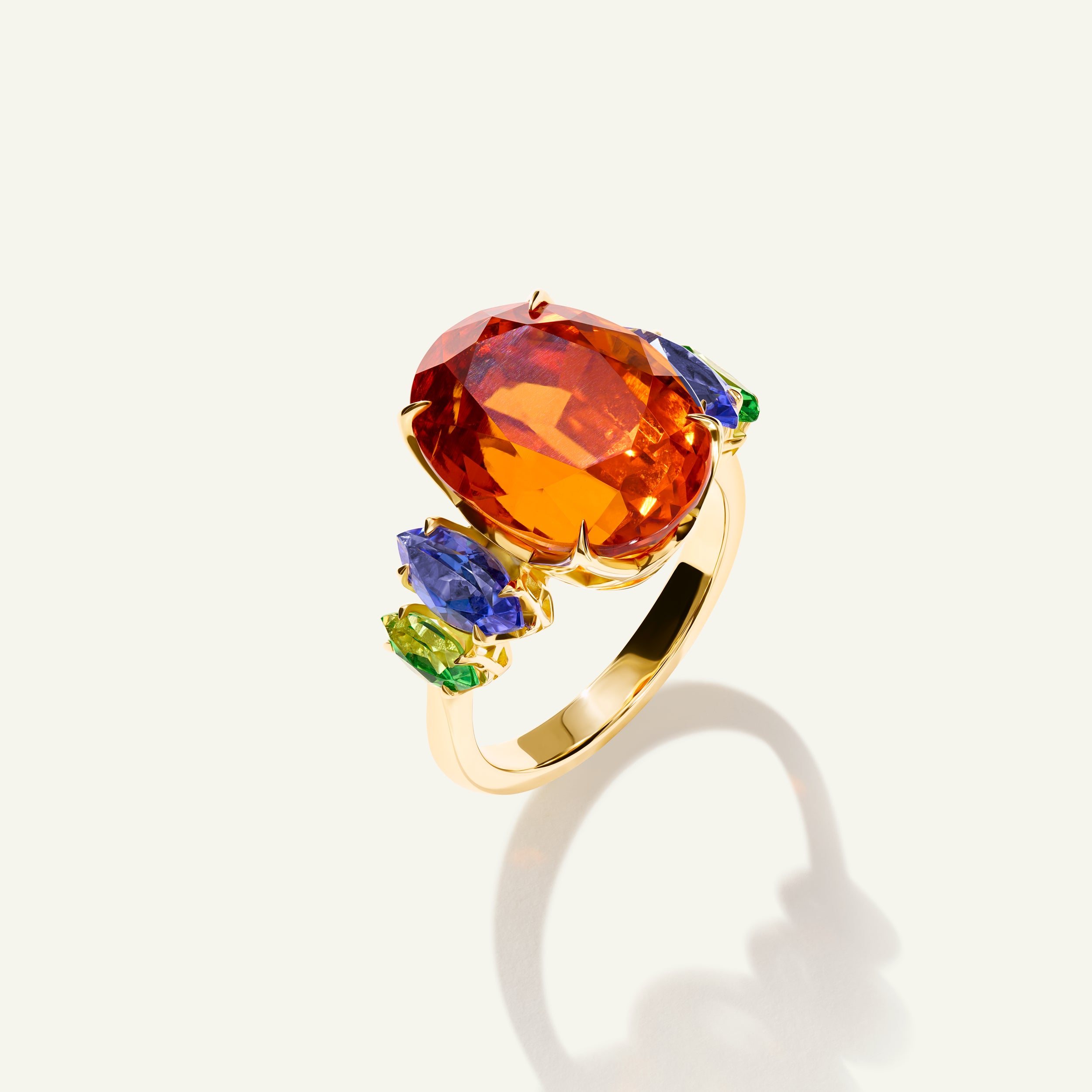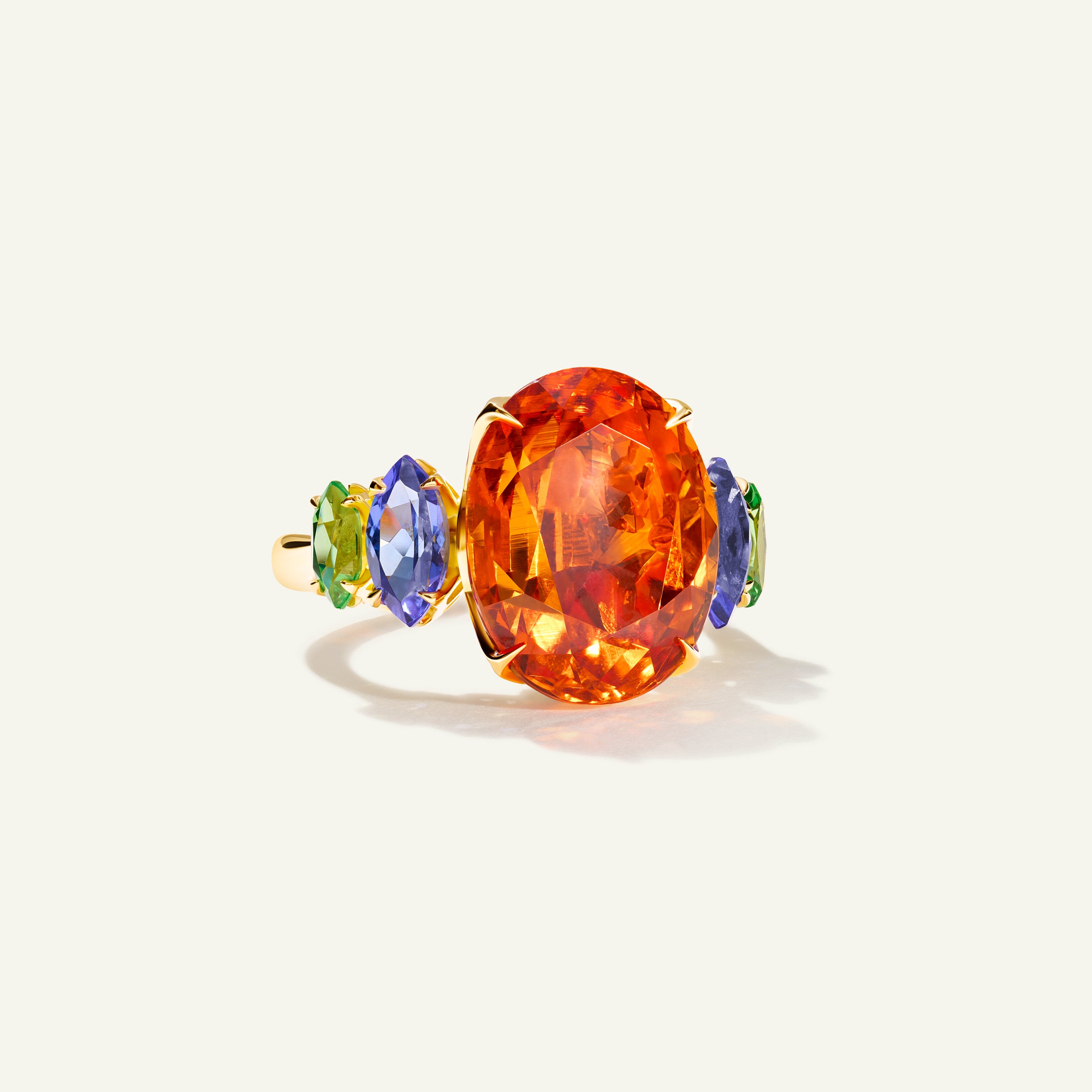 Ein oval geschliffener Mandarin Granat (16,83 Karat), 2 Tansanite im Marquise-Schliff (insgesamt 1,22 Karat) und 2 Tsavorit Granate im Marquise-Schliff (insgesamt 0,57 Karat)