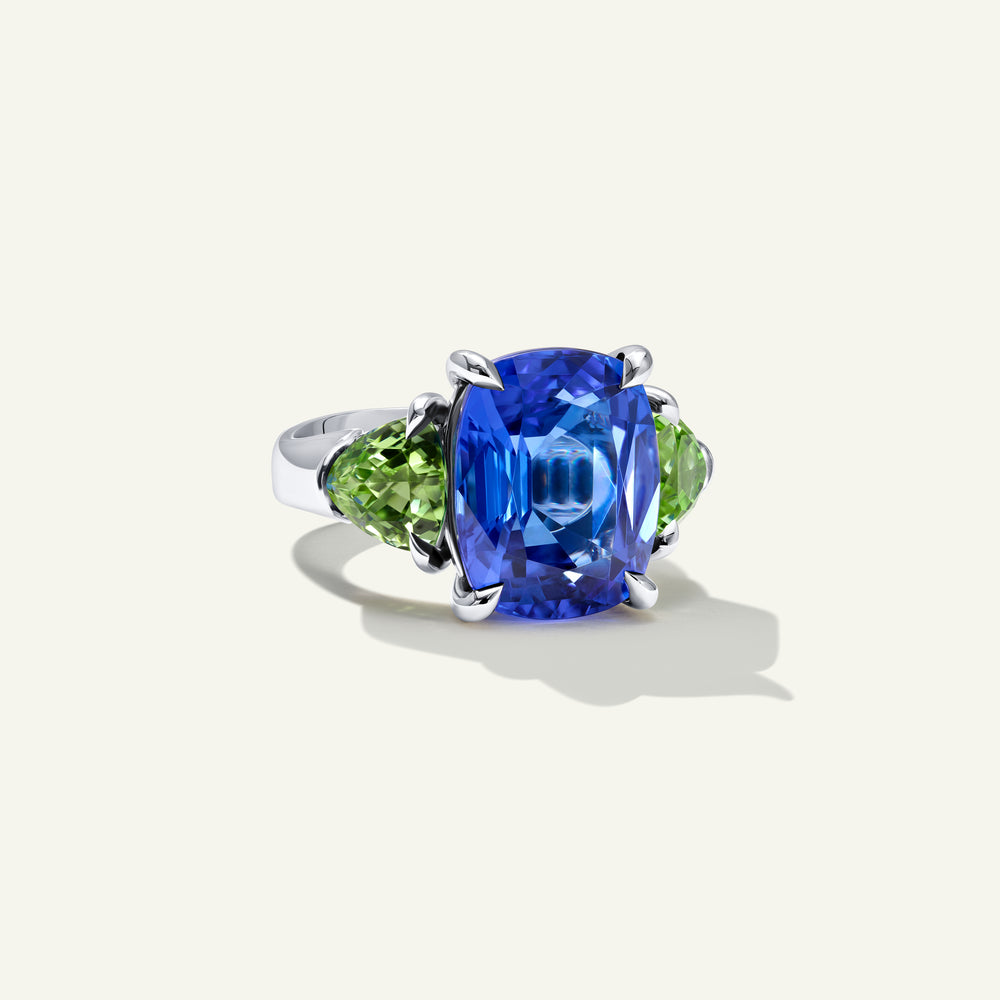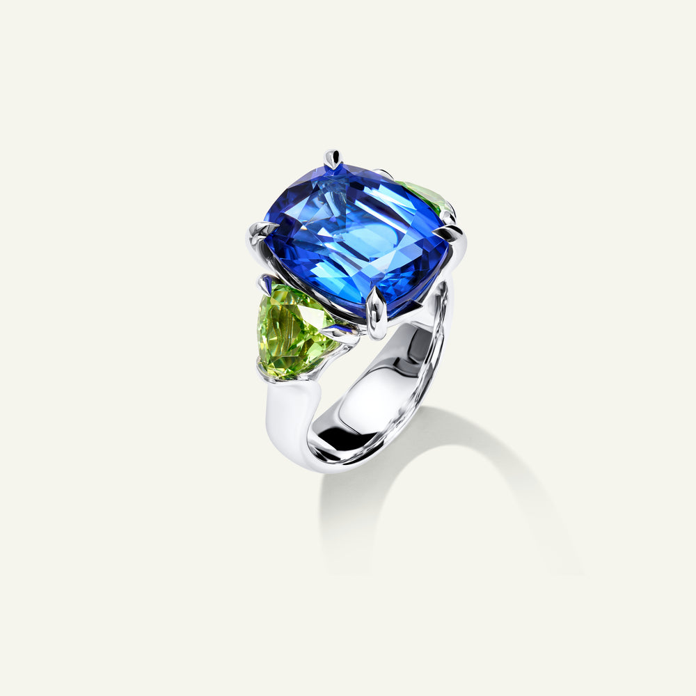Der außergewöhnliche blaue Tansanit auf diesem GLAMOUR Ring – ein neu interpretiertes Design aus dem Archiv von TAMARA COMOLLI – wird von zwei grünen Turmalinen im Trillant-Schliff eingerahmt und in 18 Karat Weißgold gefasst. Das Ergebnis ist ein einzigartiges Farbenspiel, das in jedem Licht seine Strahlkraft entfaltet. Dieses Schmuckstück ist weit mehr als ein Ring – es ist ein Kunstwerk voller Raffinesse und Eleganz.
