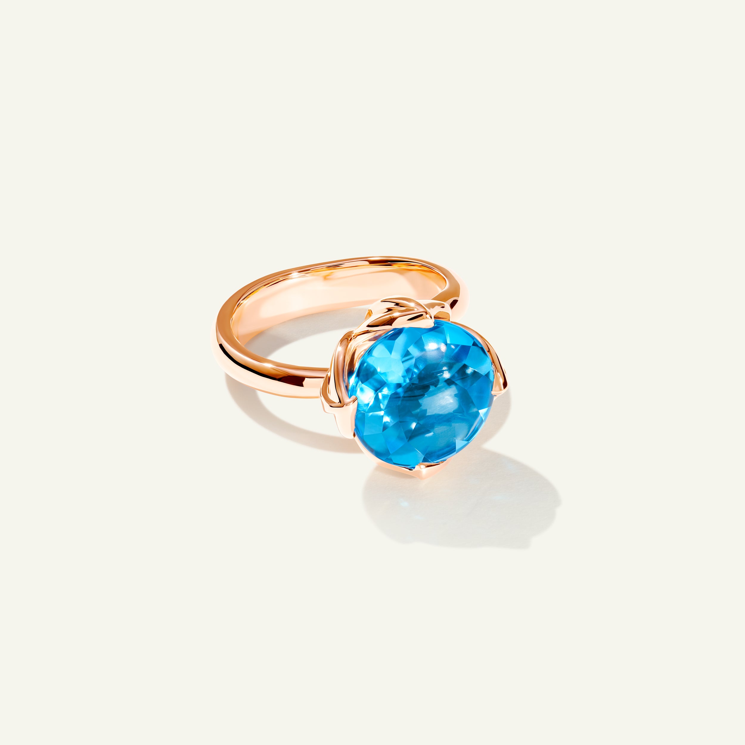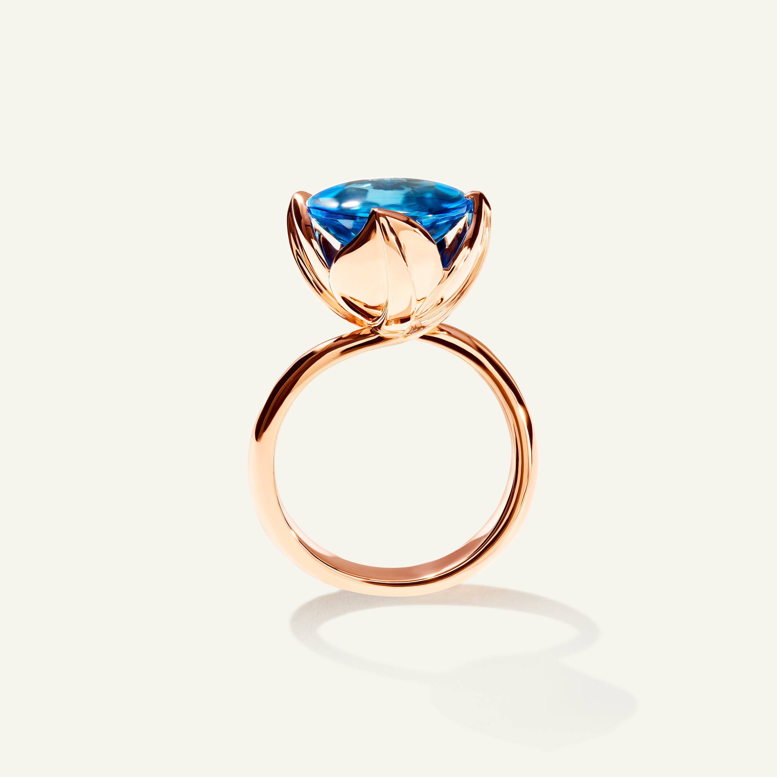 Der TULIP Large Ring präsentiert einen leuchtend blauen Swiss Topas als Mittelstein, der von einer filigranen Krappenfassung getragen und von vier kunstvoll geformten Tulpenblättern umrahmt wird. Die Ringschiene aus 18 Karat Gold schmiegt sich elegant um den Finger – entworfen, um solo getragen oder mit weiteren TULIP Ringen kombiniert zu werden und so einen unverwechselbaren Signature-Look zu kreieren.
