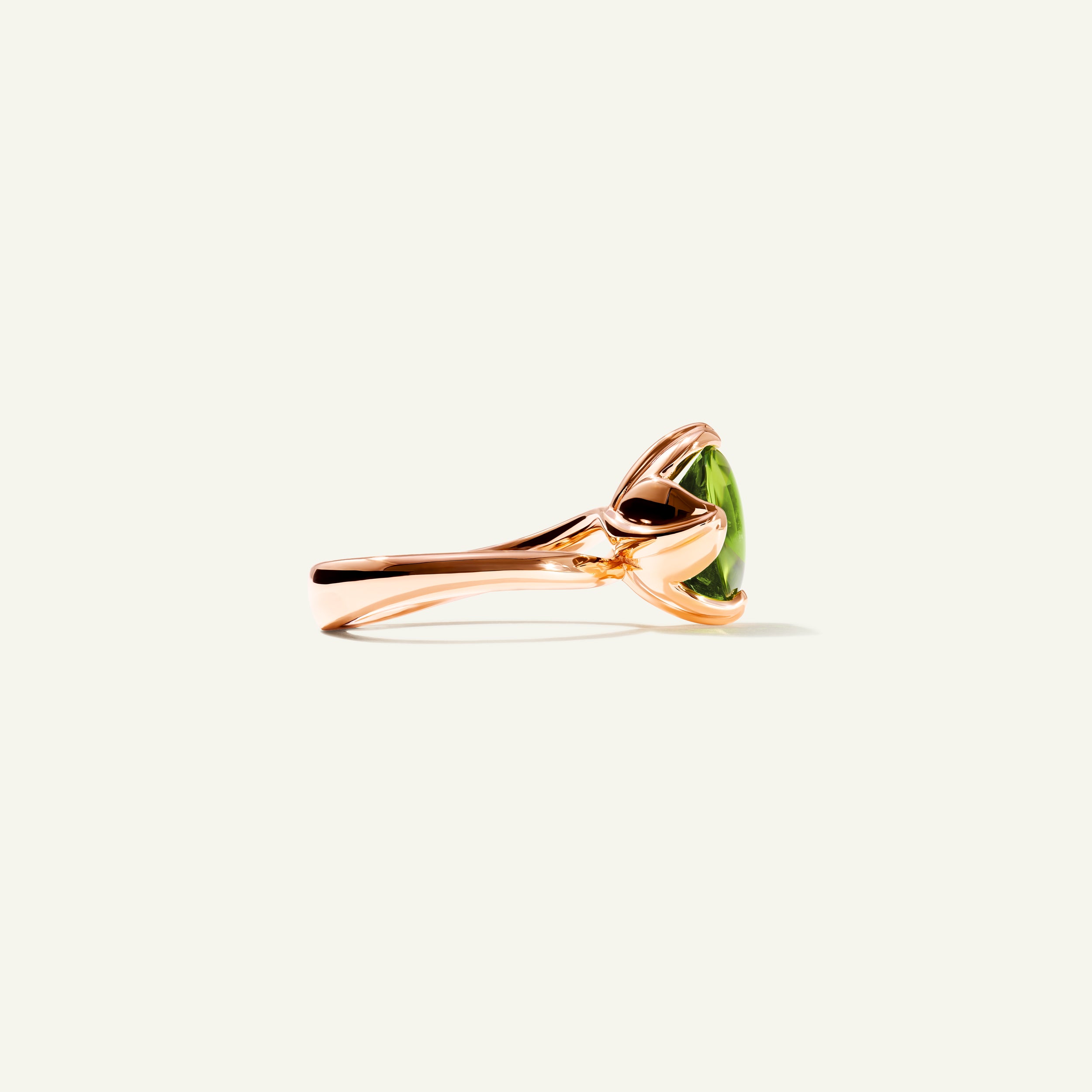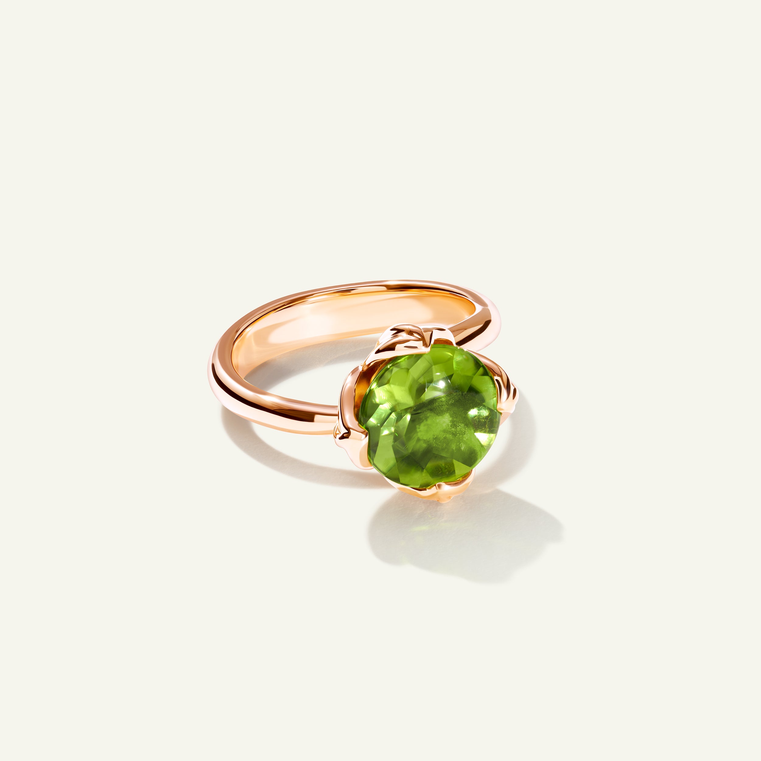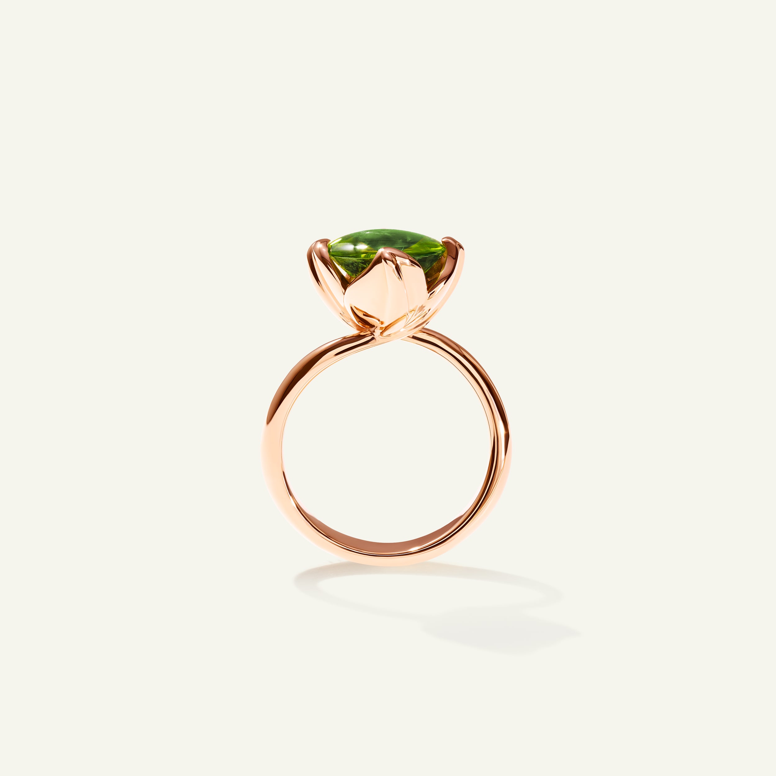 Der TULIP Small Ring präsentiert einen leuchtend grünen Peridot als Mittelstein, der von einer filigranen Krappenfassung getragen und von vier kunstvoll geformten Tulpenblättern umrahmt wird. Die Ringschiene aus 18 Karat Gold schmiegt sich elegant um den Finger – entworfen, um solo getragen oder mit weiteren TULIP Ringen kombiniert zu werden und so einen unverwechselbaren Signature-Look zu kreieren.